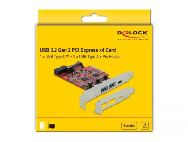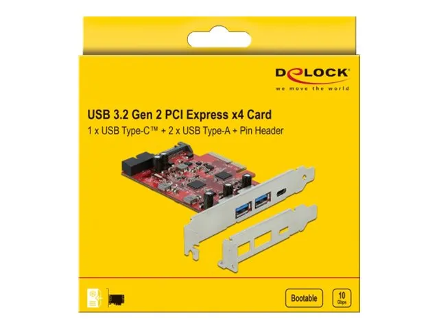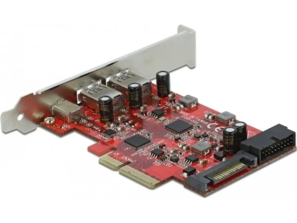 This PCI Express card by Delock expands the PC by three external USB 3.2 ports as well as one internal pin header. Different USB devices, such as docking stations, card readers, external enclosures etc., can be connected to the card.