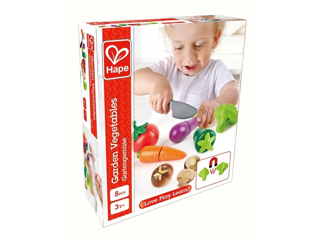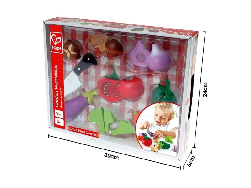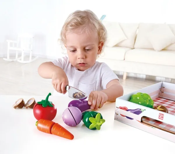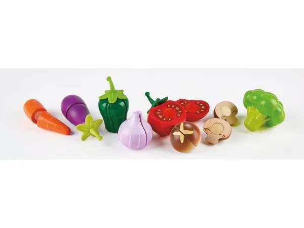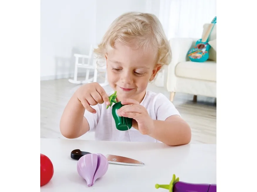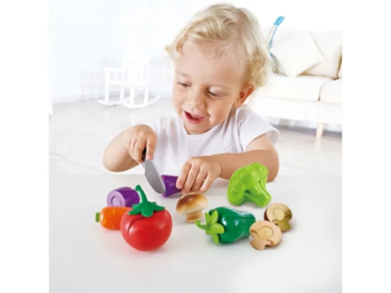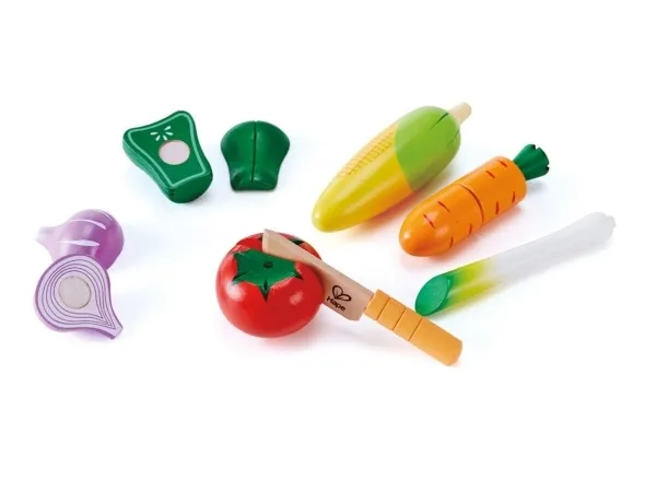 Sæt med forskellige grøntsager til at lege med. Inkluderer syv grøntsager, alle med realistiske udtryk, og en kniv i plastik. Alder 3+.