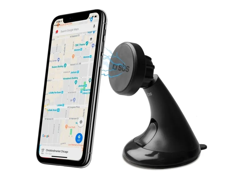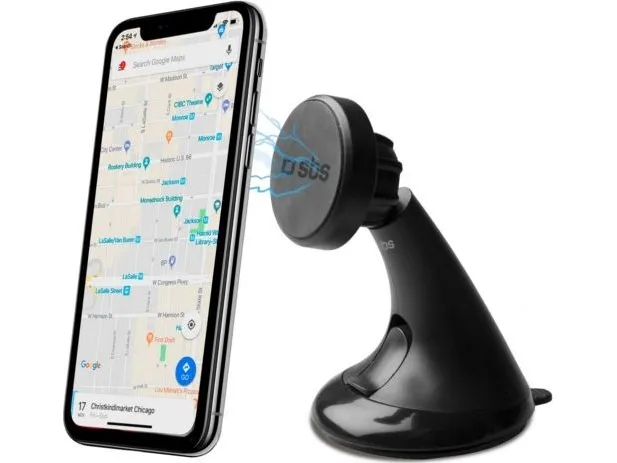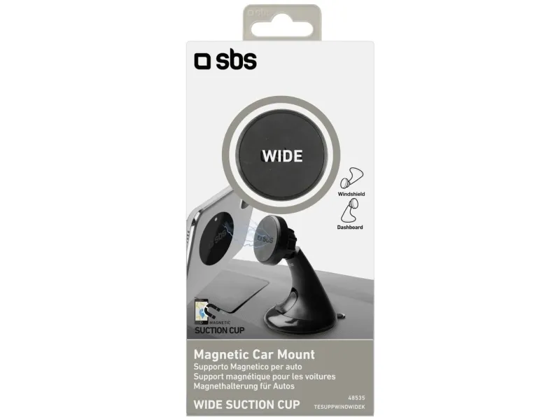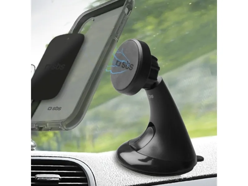 This Wide Line magnetic stand for cars is the ideal accessory to drive in complete safety.\nThis mobile phone holder is universal for all smartphones: thanks to the suction mount, you can place it on the dashboard or on the windshield according to your needs. Detaching the support is very simple: just press the small lever for an immediate release.\nThe 360 ??° rotation and the swivel joint will allow you to adjust the display according to your needs. The smartphone will remain firmly secured to the support by means of the two metal plates included in the package.\nThe circular plate is designed to fix your device directly to the magnet, while the rectangular one is positioned inside the cover or the battery slot.\n\n- Diameter: 70 mm\n- Adjustable\n- 360 ° rotation\n- Suction cup attachment for the dashboard / windscreen\n- Telephone connection via magnet\n- 2 metal plates (1 round and 1 rectangular) included