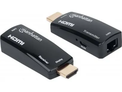 The 1080p Compact HDMI over Ethernet Extender Kit - a space-saving way to extend HDMI to where you want it The Manhattan 1080p Compact HDMI over Ethernet Extender Kit can connect nearly any digital HDMI source (e.g., gaming console [PlayStation®, Xbox® and more], Blu-ray player, satellite receiver, digital recorder, etc.) to an HD display or projector at a distance up to 60 m (196 ft.) with one Cat6 Ethernet cable. The Kit provides reliable 1080p@60Hz resolution video and multichannel audio transmission over longer distances than HDMI cables alone. Its slim and compact design is ideal for installations in confined spaces or virtually anywhere.