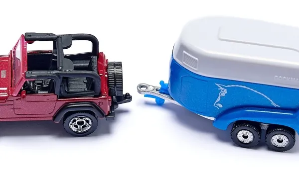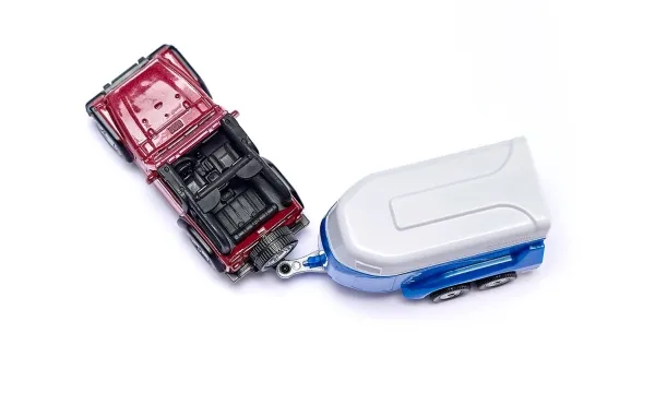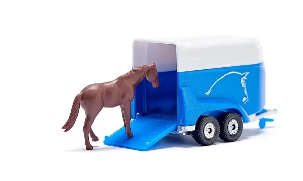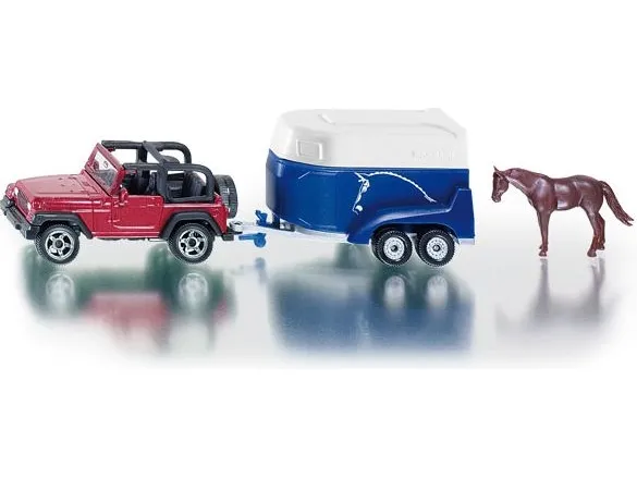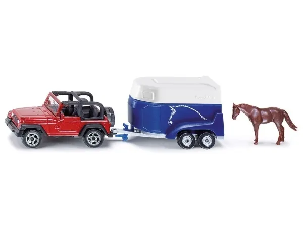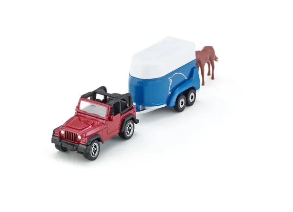 The Böckmann Jeep Wrangler with horse trailer is the classic combination to transport horses off the beaten track. The body of the Jeep and chassis of the horse trailer are produced in die-cast metal. The trailer has an opening loading flap and one horse is supplied as an accessory.