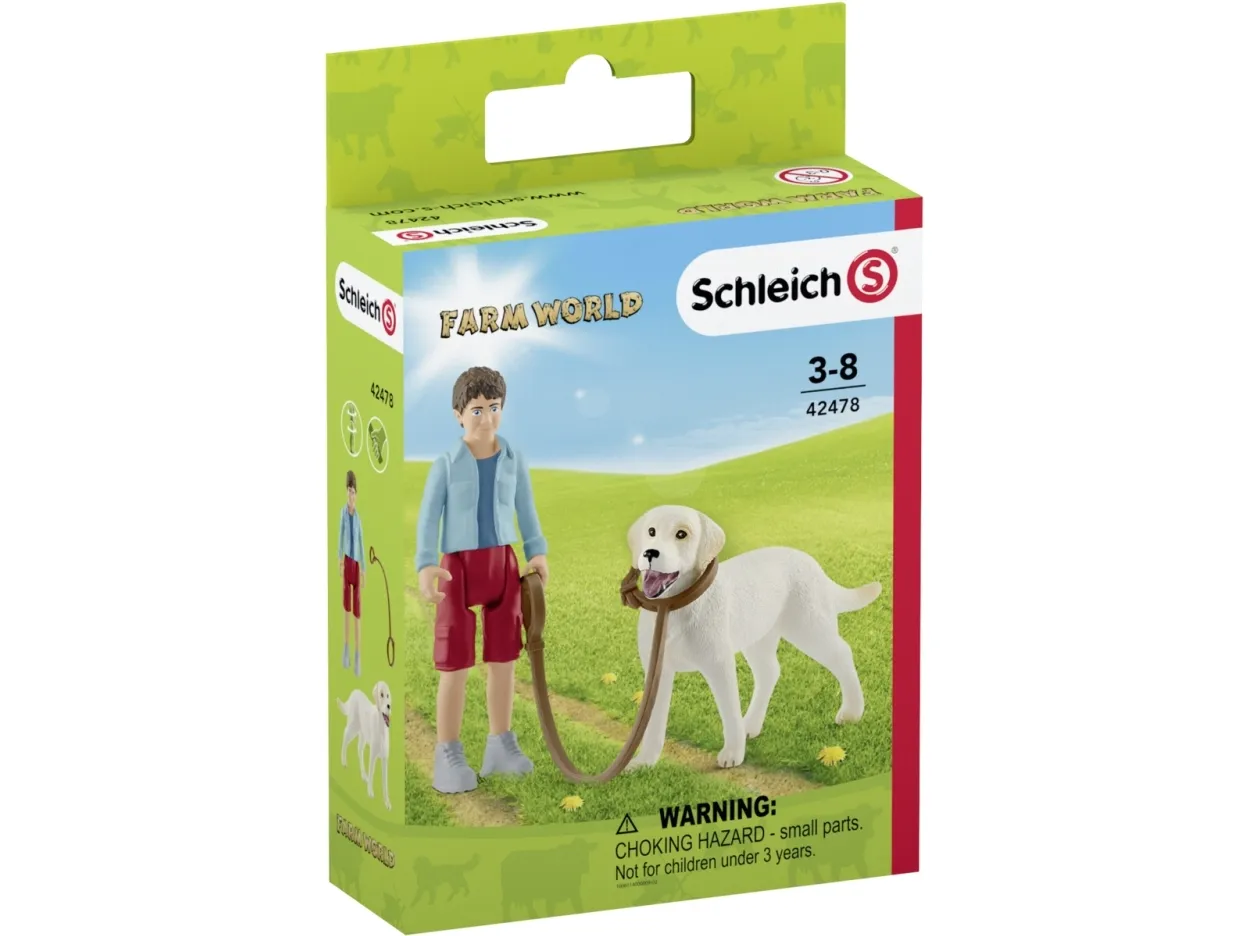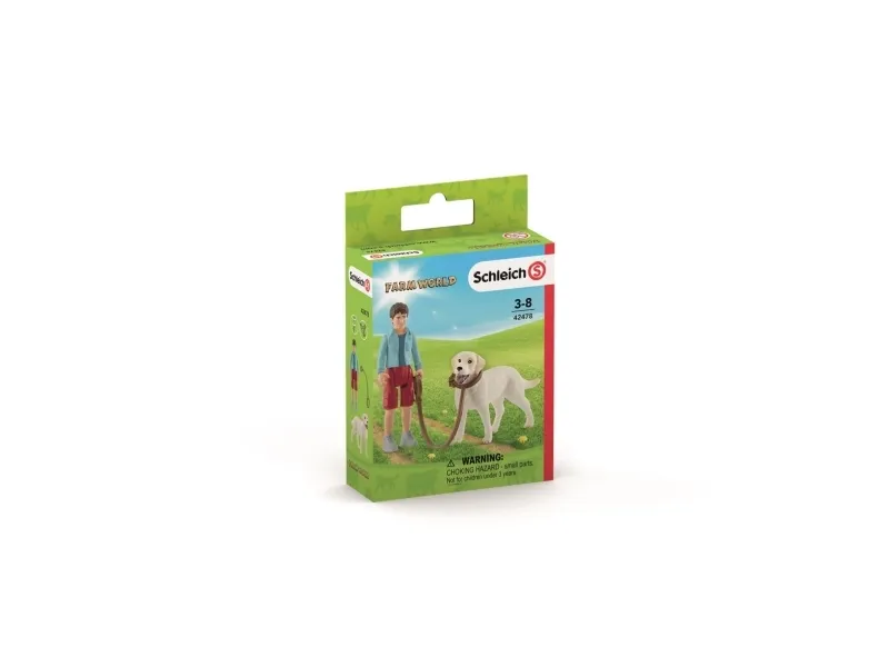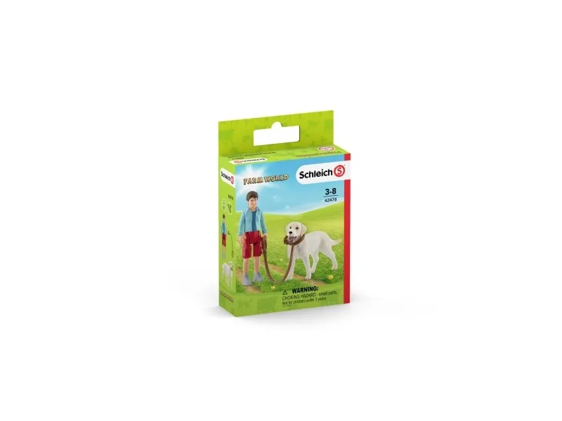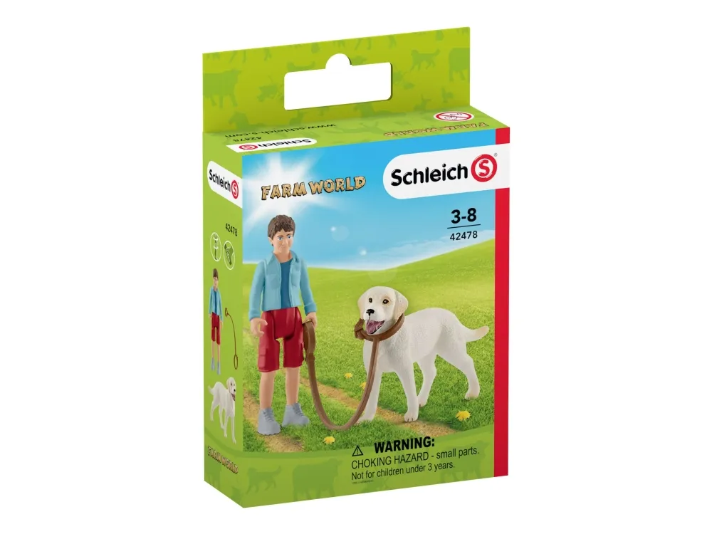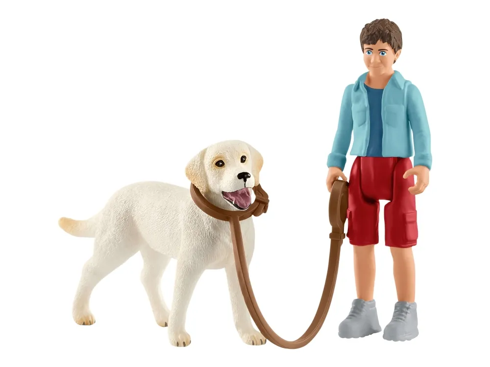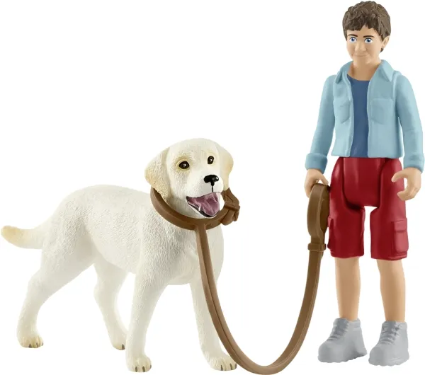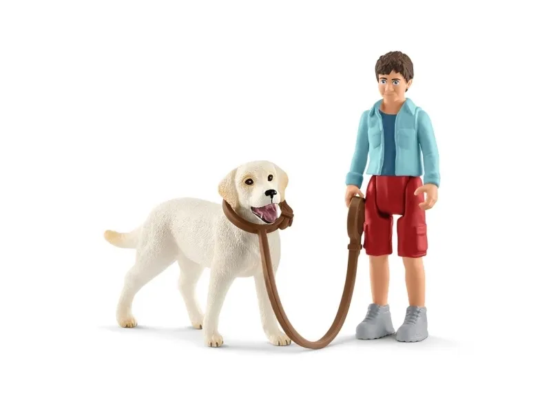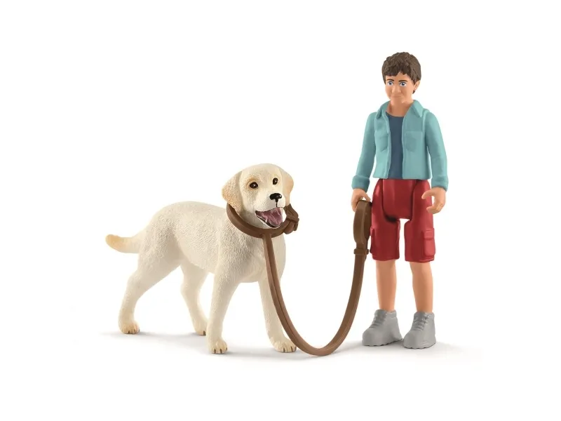 Labrador retrieveren kommer ivrig med båndet til eieren sin, og bjeffer forventningsfullt til ham. Gutten hekter båndet på halsbåndet, så er de klare for å gå tur! På turen lar gutten løpe hunden fritt på en stor eng, og kaster pinner for å leke med ham. De er bestevenner.