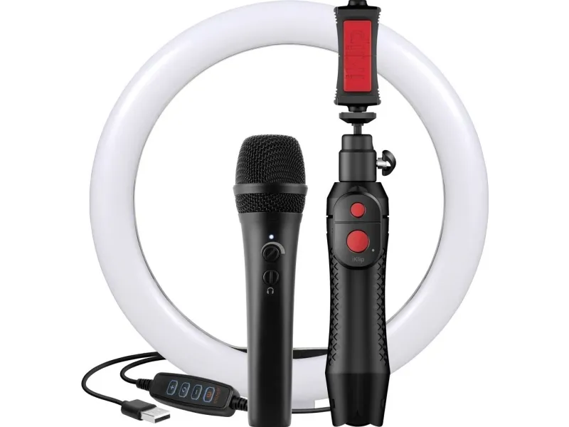 IRig Video Creator HD Bundle er den all-in-løsning til førsteklasses, opsigtsvækkende videoer og live-streaming på dagens top-websteder. Dette nye sæt giver dig alt nødvendigt værktøj til at lave professionelle videoer, som skiller sig ud fra mængden. Kern i dette parlament Det er den eneste digitale High-Definition USB håndholdte-kondensatormikrofon til iPhone, iPad, MAC eller PC og ideal for sangere, musikere, interviews, præsentationer, broadcasts, podcasts, blogs og Vlogs, når det handler om at lave optagelser i høj kvalitet hvor som helst og uden større besvær. Den imponerer med sin 24 bit omformer i høj kvalitet med sample rates på op til 96 kHz, en støjsvag forforstærker, gyldne sprøjte elektret-kondensatorkapsel og en hovedtelefonudgang inklusive lydstyrkeregulering til direkte monitoring eller afsendelse af lydsignaler til en ekstern enhed, som for eksempel en ekstra recorder, en mixer eller til et PA-system. Med i leveringen følger alle nødvendige kabler og andet tilbehør, så man er bevæbnet til alle optagesituationer, herunder også en lille Tripod-stander, som man kan bruge ved interviews, telefonsamtaler eller videokonferencer. Bundle fuldendes af det smarte kamera-/mobiltelefonstativ iKlip Grip Pro og 10 en LED-ringlampe med valgbare farvetemperaturer, der kan dæmpes.