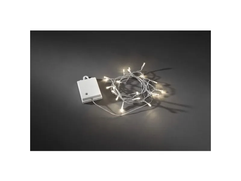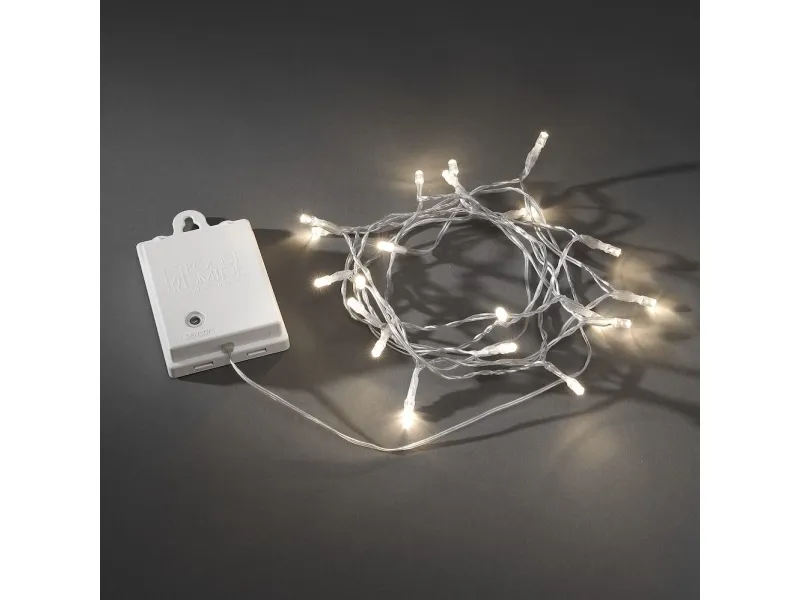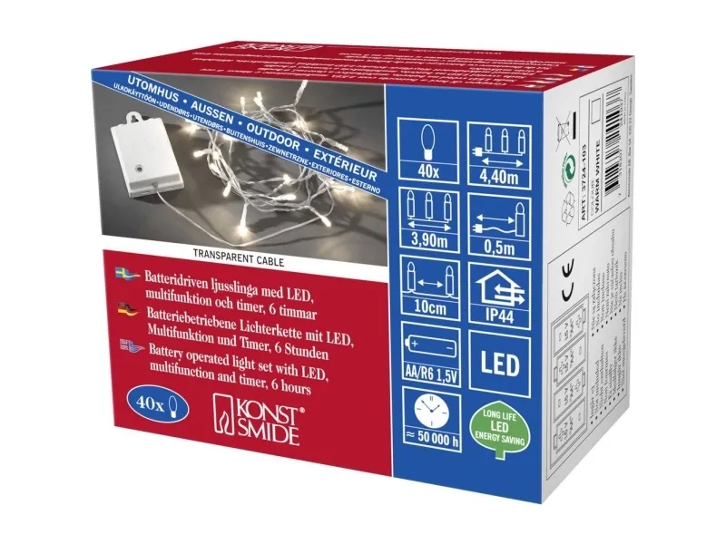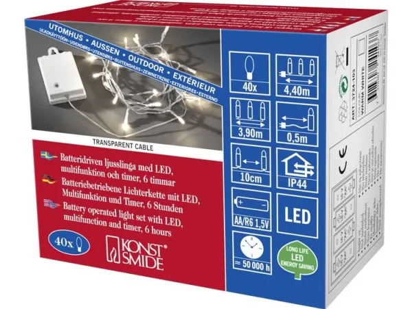 LED-lyskæde Denne batteridrevne LED-lyskæde til udendørs brug fra kvalitetshuset Konstsmide er ikke blot et funklende highlight til enhver festlig dekoration, men er også et lille teknisk vidunder. Udstyret med afbryder, 6h-timer, 8 funktioner og memory-funktion giver den den højeste komfort, som man kan ønske sig ved en førsteklasses udendørsdekoration. Batterirummet kan nemt åbnes og lukkes, skruetrækker behøves ikke. Glæd dig over en funklende jul - år efter år, for du og dine kære kan få glæde af dette langtidsholdbare kvalitetsprodukt fra firmaet Konstsmide i mange år endnu. Firmaet Konstsmide har i mere end 40 år specialiseret sig i at lave førsteklasses lysdekorationer til indendørs og udendørs brug og har siden 1999 været toneangivende inden for miljøvenlige, holdbare og sikre LED-løsninger.