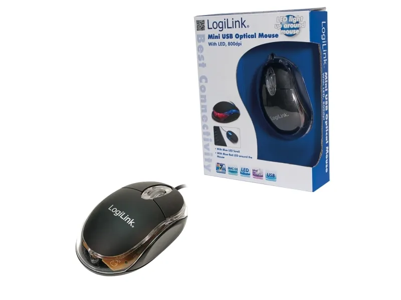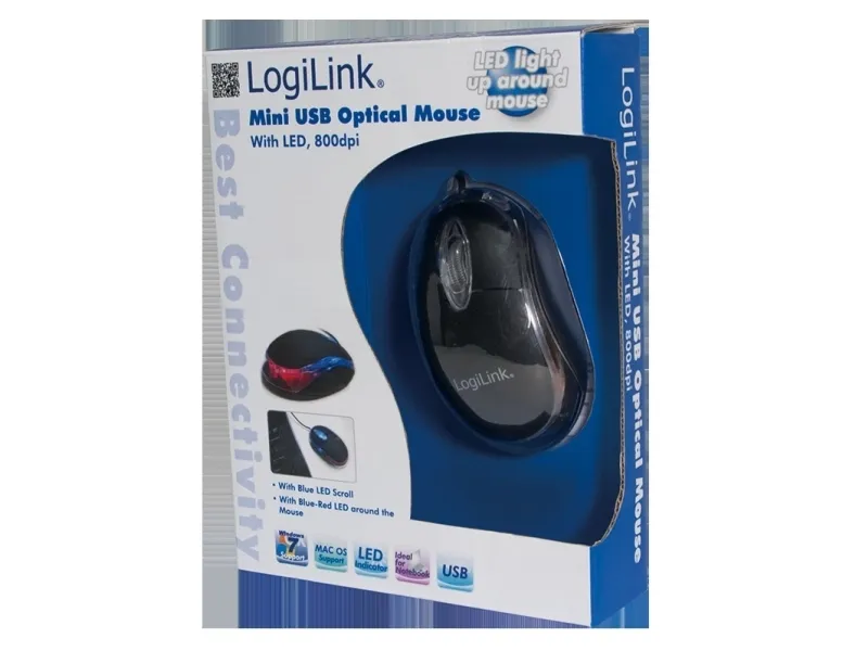 Mini notebook mouse with USB connection from LogiLink with optical sensor and 800 dpi resolution for high precision and fast operation. The rubberized surface prevents slipping and provides a solid grip. With the LEDs illuminating the scroll wheel and the side of the mouse it is a true design object.