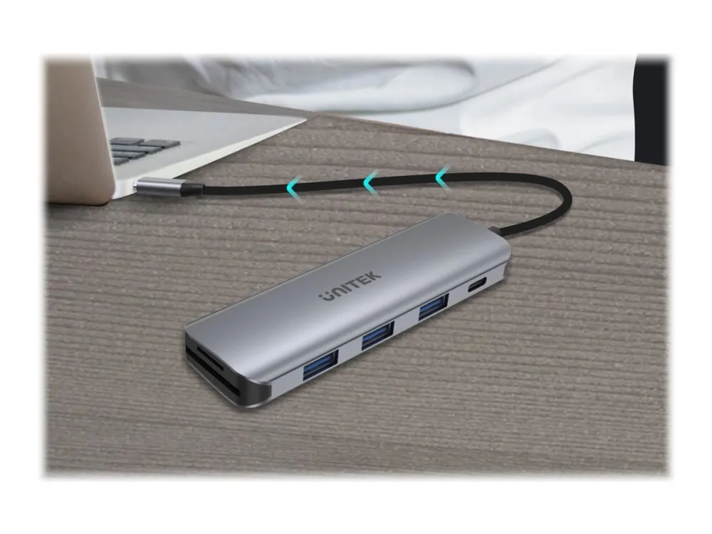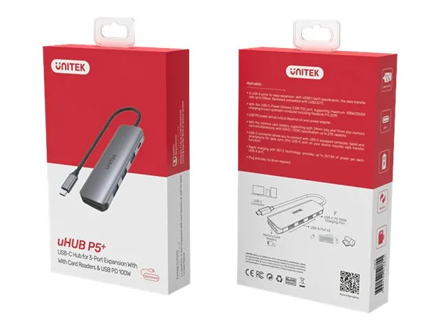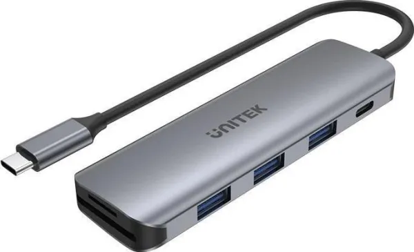 The uHUB P5+ is a USB-C hub with an ultra-slim aluminum housing. It offers you several ports for expansion, plus fast charging and a card reader.