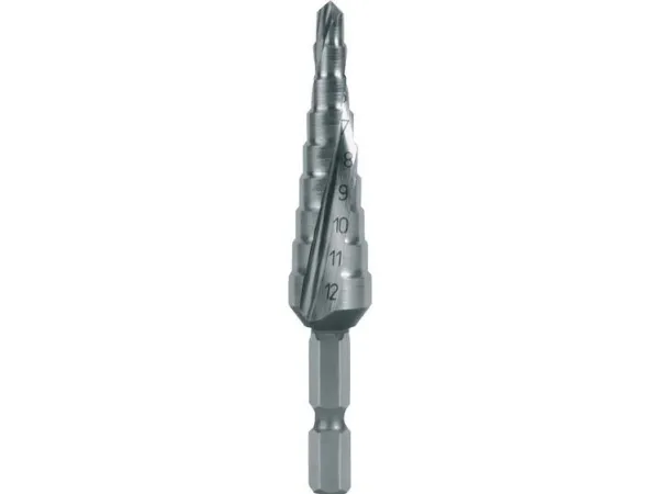 Trinbor-bit HSS, spiralnot med krydsslibning Størrelse nr. 0/9. Boreområde 4,0 - 12,0 mm. NEXT GENERATION - med dette robuste værktøj kan i en arbejdsgang centreres, bores, bores op og afgrates. Den dybslebne og spiralformede spændsot giver absolut stille drift og høj skærekapacitet. Især spåner, der ikke bryder ud, transporteres rene som ved et spiralbor. Dette reducerer dannelsen af karrosserisektioner og koldsvejsning på snitene. Konus letter tilbagetrækning ved gennemborede plader. HSS: Højeffektivt hurtigstål til boring i velredigerbare materialer med en styrke på op til 900 N/mm².