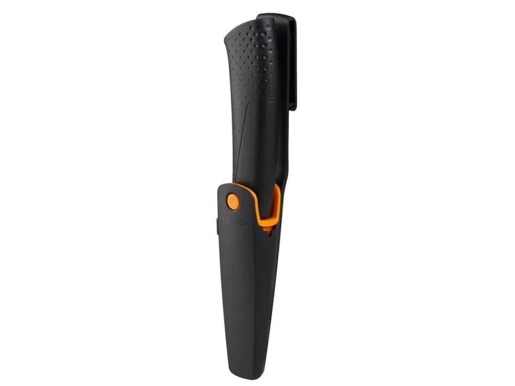 Fiskars Builder's knife with sharpener is a utility knife with a high-quality steel quality blade for general use. It is part of a new range of utility knives with an integrated sharpener from Fiskars that has been developed jointly with the most demanding knife users. The innovative built-in, easy-to-use sharpener is always with you guaranteeing sharper cuts without any interruptions to the task. The handle provides an ergonomic grip and the innovative sheath has a reversible collar allowing for either left or right-handed use.