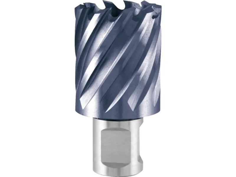 Kernebor HSS-tin med verdensomspændende-skaft (3/4). Dia. 22 mm. Dia. 22 mm, skæredybde: 30 mm - kernebor af højtydende hurtigstål med Titan-aluminium-nitrid-belægning. Med TiAlN-slidbeskyttelsesbelægningen øges værktøjets overfladehårdhed til ca. 3.000 HV / mikrohårdhed og varmehærdebestandighed til op til 900 °C. Det udmærker sig ved høj sejhed samt høj termisk og Kemisk stabilitet og tjener til at opnå højere standtider og snitværdier. Takket være TiAlN-belægningen er den velegnet til tørbearbejdning. Især egnet til bearbejdning af ulegeret og legeret stål (op til 1200 N/mm²), kromlegeret stål som for eksempel V2A og V4A, samt stålkul og sej. Ved hjælp af en videreudviklet skæregeometri er det muligt at opnå en betydeligt bedre skæreadfærd, Hvilket er positivt for skæreydelse og holdbarhed.+ optimeret skærgeometri for øget spåneffekt og reducerede skærekræfter.+ spånvinklen er designet til universel anvendelse i forskellige ståltyper.+ forbedret spånfjernelse ved U-formet udlukker. Den specielle geometri i udlukker reducerer den termiske belastning af HSS-kernboret, da den Varme, der opstår ved spåntagning, i vid udstrækning føres væk med span.+ reduktion af friktionen mellem HSS-kernebor og emnet med optimerede, spiralforløbende føringsfaser. Kan anvendes i alle søjle- og magnetstanderboremaskiner med Morsekonus i forbindelse med Ruko optageholder nr. 108 302 / 108 303 / 108 315 / 108 316, Ruko EasyLock nr. 108 312 / 108 313 / 108 314 eller med direkte verdensdonordtagelse som Ruko magnet søjleboremaskine RS5e / RS10.