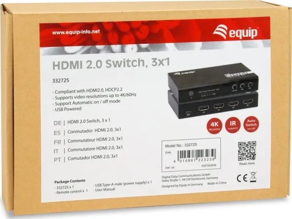 The Equip HDMI 2.0 Switch 3x1 makes it possible to change conveniently between 3 HDMI input sources (DVD/Blu-Ray Player, game consoles, streaming boxes/sticks, digital receivers...etc) via remote control, intelligent automatic recognition or alternatively by switching the switch itself. The hassle of reconnecting cables is a thing of the past. Thanks to Ultra HD 4K (60 Hz) support, experience your media content in brilliantly sharp resolution.