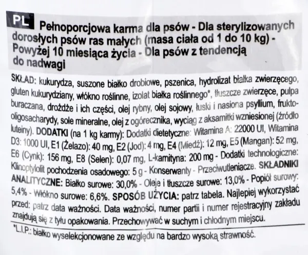 For neutered adult dogs Combination of high protein content (30 %) and moderate fat intake (13 %) that helps maintain an ideal weight. Designed for small neutered dogs, the nutritional profile is enriched with L-carnitine and features gut-healthy fibre so your dog enjoys the same volume of food while reducing his calorie intake.