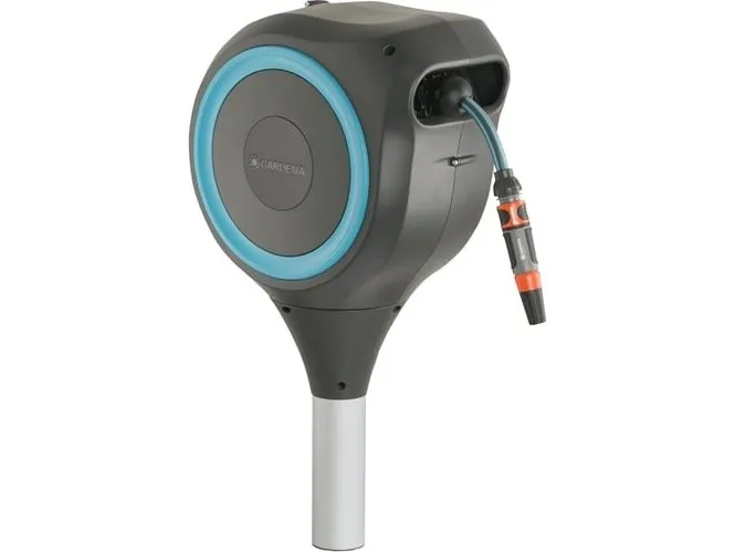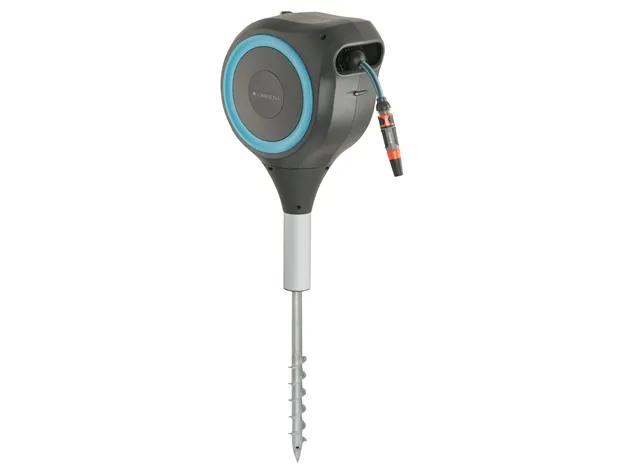 Watering that's always ready for action: The GARDENA Garden Hose Box RollUp S is no ordinary hose storage box. You will be thrilled how effortless watering your garden can be with this well-designed hose box. You can easily water your small garden and have maximum freedom of movement. It stands on a sturdy metal spike meaning you can install it anywhere in your garden without damaging a wall. The ground spike is screwed into the ground using a mounting rod and is therefore extremely stable. For use, simply extend the garden hose to a maximum of 15 meters and you can start watering immediately. The built-in short locking points ensure effortless handling and automatically fix the hose at the desired extension length. Thanks to the innovative design, the hose box can be swiveled through 360° and you can reach every corner of your garden. The hose box follows your movements while watering and prevents the water hose from kinking or tangling. In addition, this Garden Hose Box saves you from strenuous cranking, bending over and wet, dirty hands when rolling up: A short pull on the unrolled hose activates the integrated spring, which rewinds the hose fully automatically and reliably. To ensure that no blockages or twists occur, a hose guide keeps the garden hose on track and the RollControl technology ensures safe and controlled rewinding. The box is adjusted to the height of the GARDENA Mowing Robots, so that the lawn around the hose box is always maintained and mowed. The high-quality material is protected by UV and frost protection, the box can remain in the garden all year round and guarantees you a long service life and use without maintenance. The box is especially compact and stylishly designed so that it can be easily integrated into any garden. The Garden Hose Box comes with a flexible connecting hose, all necessary assembly parts and original GARDENA System Elements as well as a sprayer with two different spray patterns.