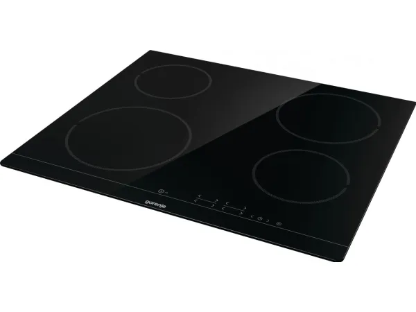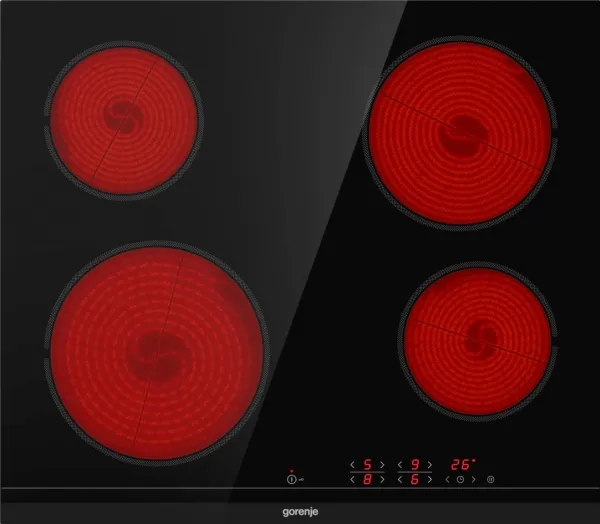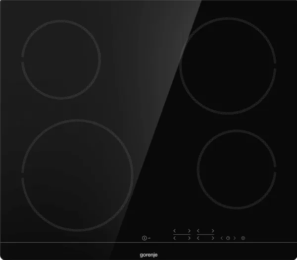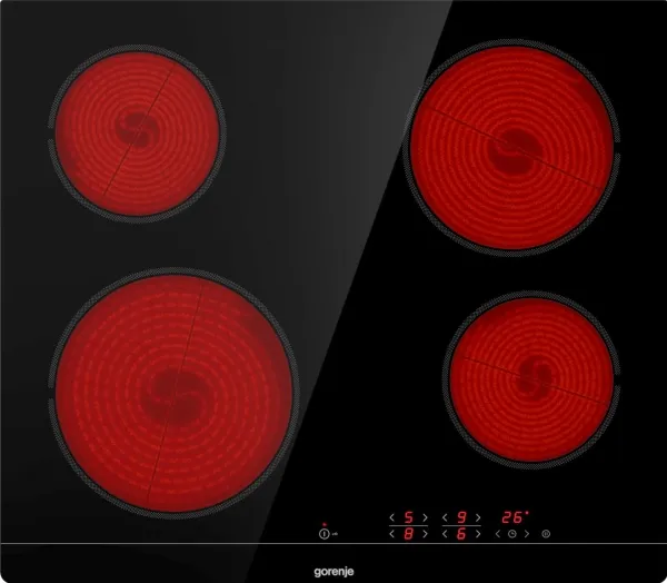 Gorenje ECT641BCSC. Product colour: Black, Appliance placement: Built-in, Hob width size: 60 cm. Simmer cooking zone: 1200 W, Regular cooking zone: 1800 W, Large cooking zone: 2300 W. Control type: Touch, Control position: Top front, Timer type: Digital. Connected load (electric): 6500 W. Width: 600 mm, Depth: 520 mm, Height: 54 mm