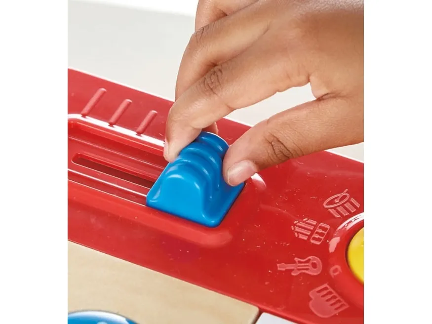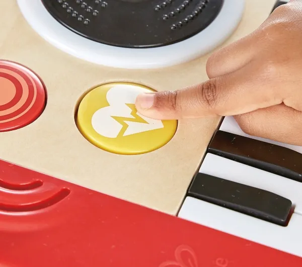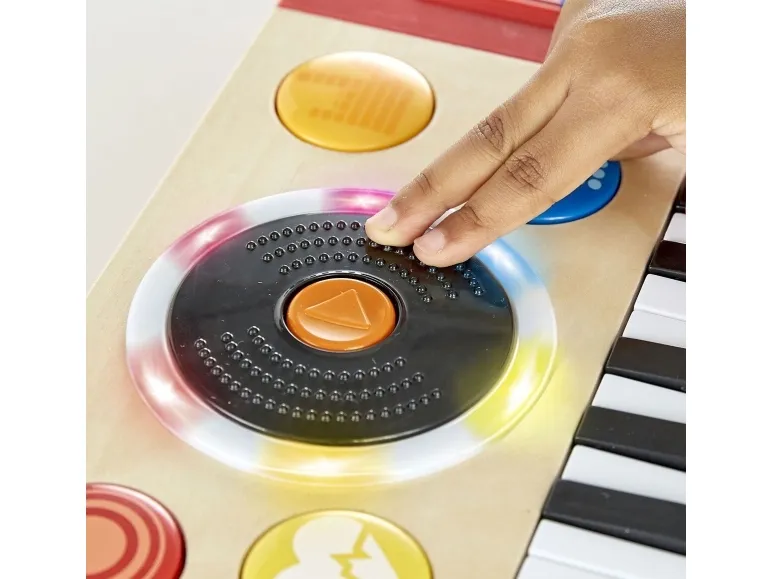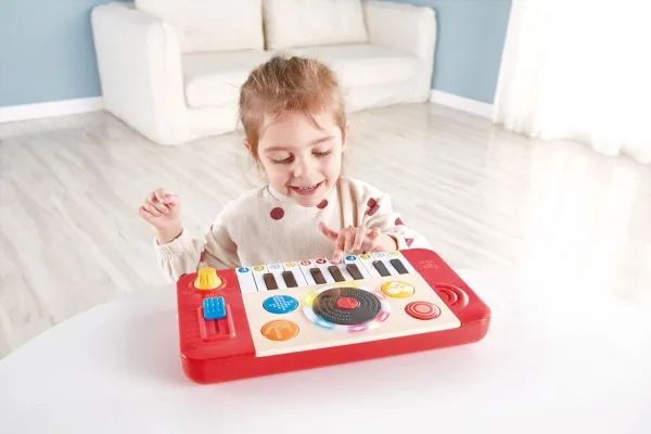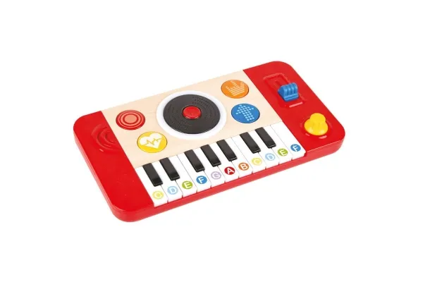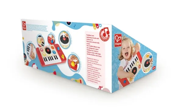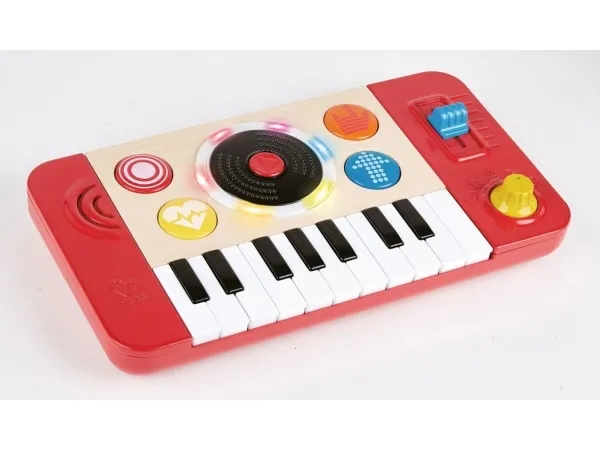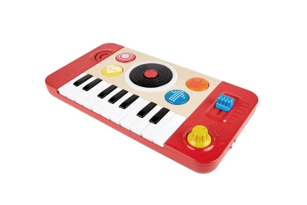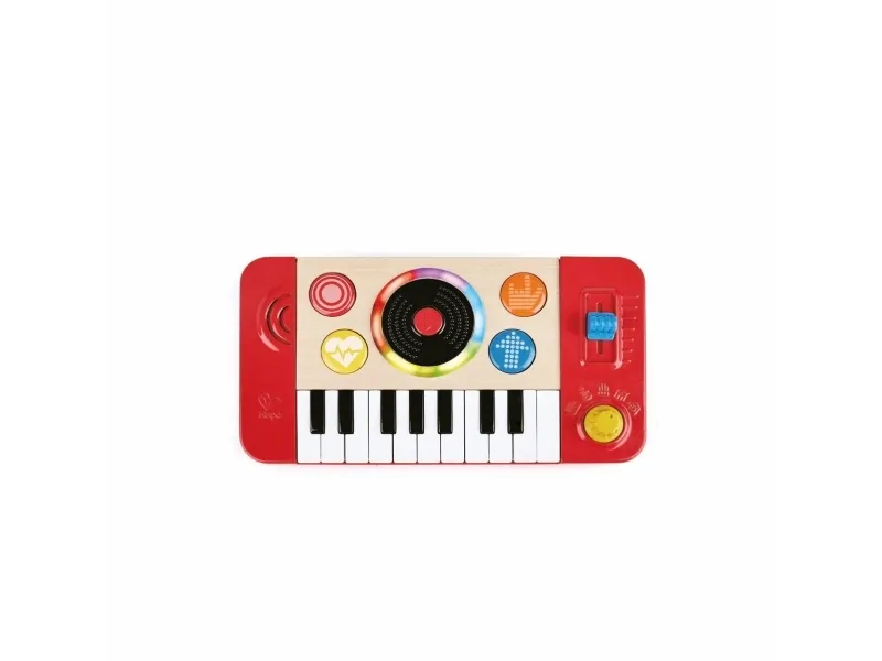 Hape’s DJ Mizer Studio oppmuntrer de yngste musikere til å spille, lære og udforske deres musikalske evner. Spin Studio er den perfekte kombinasjon av læring og lek. Barna bygger sterkere hukommelse, mens de utforsker de forskjellige lyder og rytmer. - Keyboardet har 18 tangenter - Vri på den gule knapen for å velge en av fire instrumentlyder eller 18 morsomme lydeffekter - Trykk på knappen i midten for å velge en av fem bakgrunnsmelodier - Trykk på de andre 4 knappene for å tilføye DJ-lydeffekter - Det er mulig å justere tempoet på leketøys-pulten - Tilføj ”scratching” effekter ved å bruke den sorte skiven