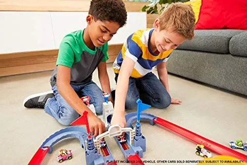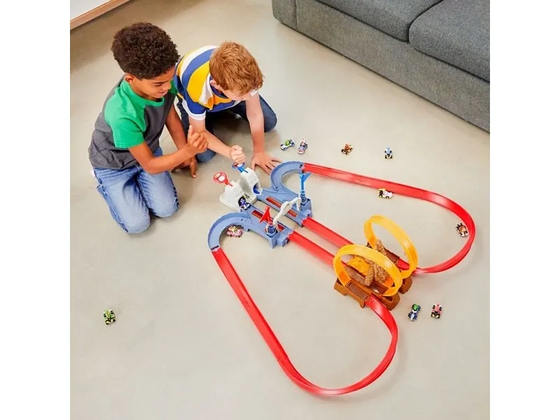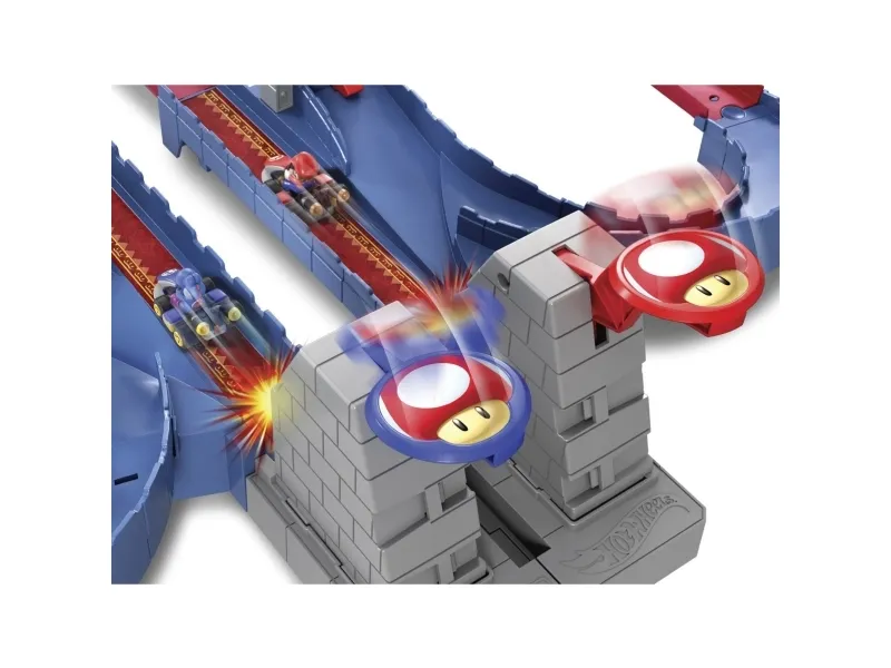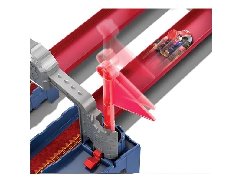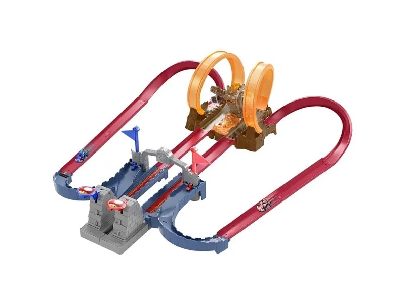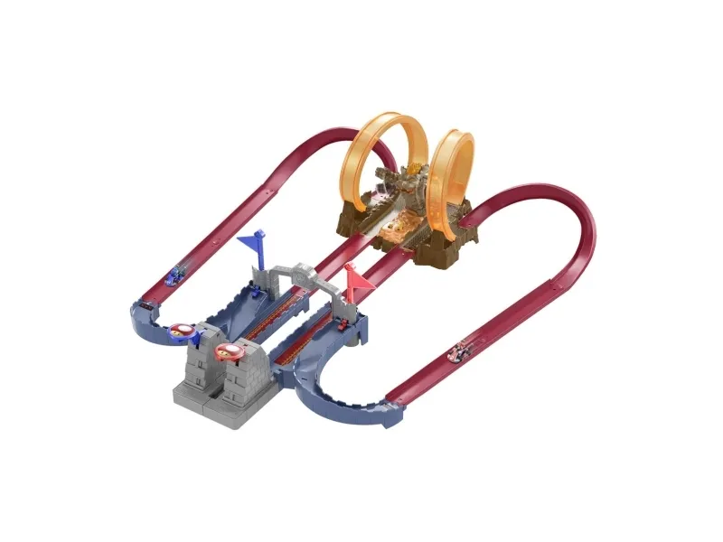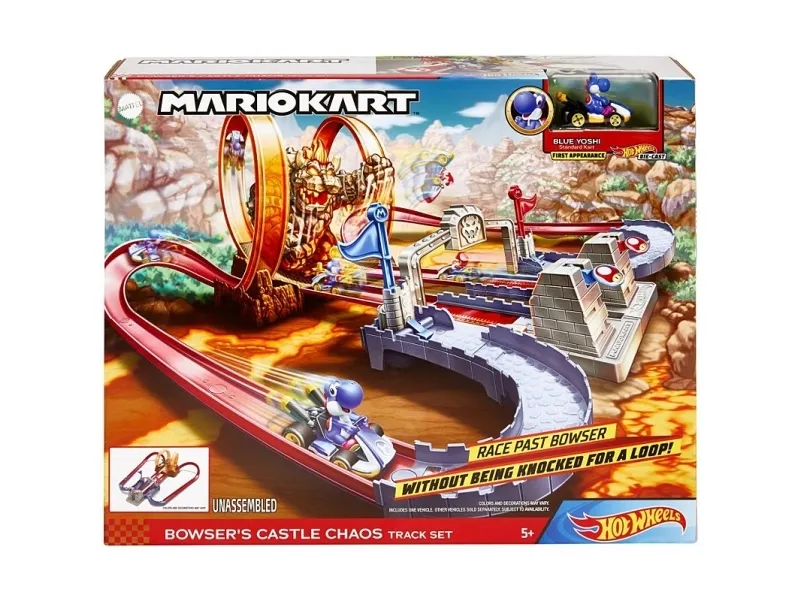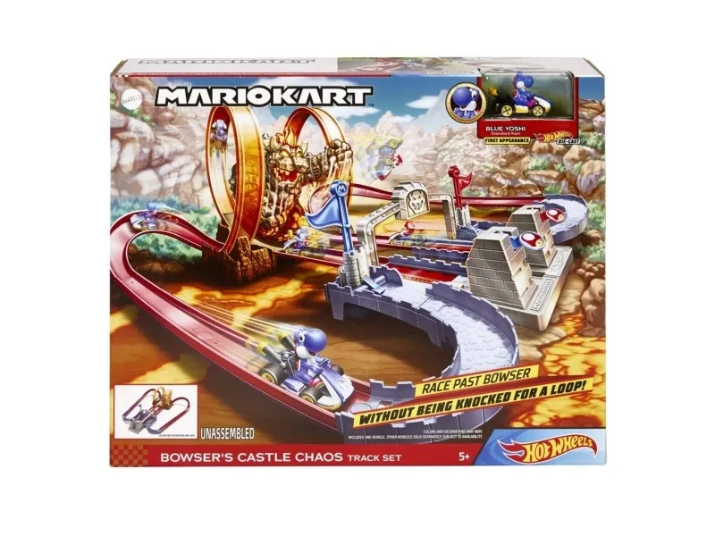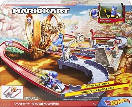 Kids can race their Hot Wheels Mario Kart™ replica vehicles to overcome the baddest Mario Kart™ nemesis — Bowser! Side-by-side racing, counting lap flag and reconfigurability makes this track set a thrilling experience. Kids must dodge Bowser's fists to get past him, around the banked turn, and complete 5 laps to beat their opponent and win the race. Includes one replica die-cast Yoshi vehicle. Up the level of difficulty and amp up challenges by reconfiguring the track and connecting the Piranha Plant, Thwomp Ruins track sets and the Mario Kart™ Circuit track set (sold separately).