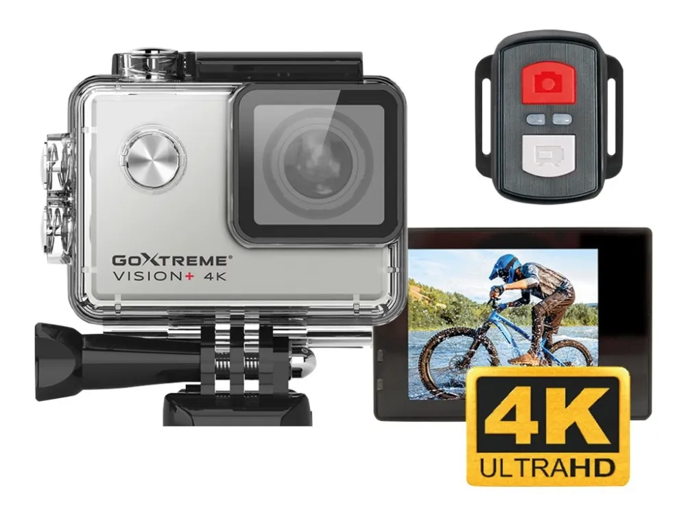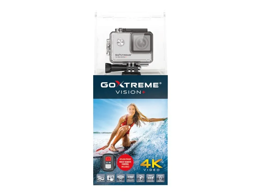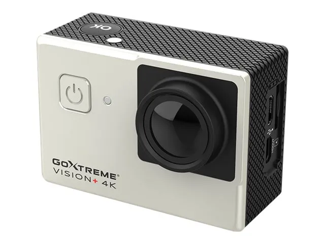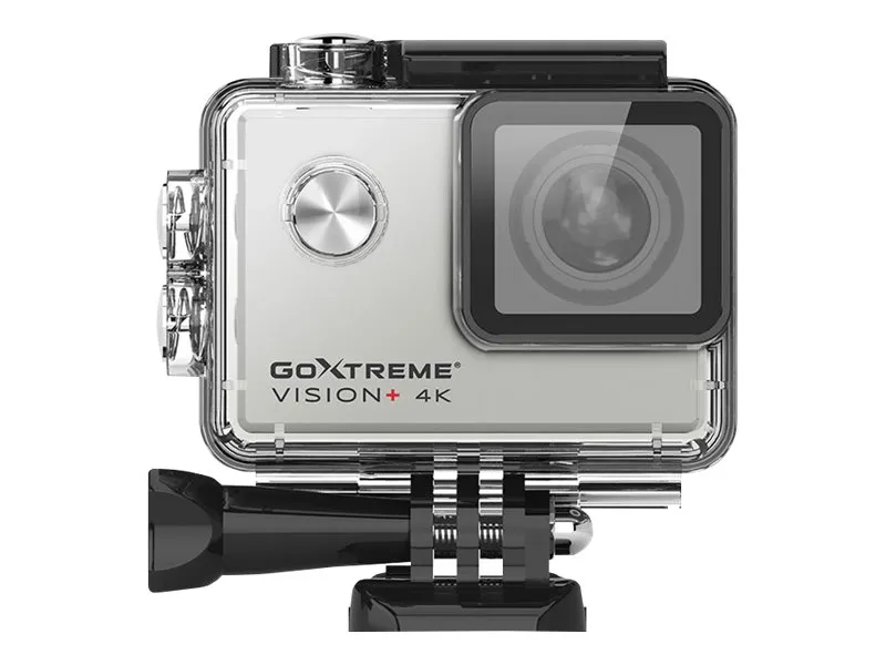 Actioncam GoXtreme vision 4K + Display: 2 / 5 cm touchscreen · vandtæt kabinet op til 30m · sensor: 12 MP · billedopløsning: 16 M interpoleret; 13 M interpoleret; 8M · videoopløsning: 4K (3840x2160) 30fps; 2,7 K (2720x1520) 30fps; 1080p (1920x1080) 120fps, 60fps, 30fps; 720p (1280x720) 240fps,120fps, 60fps, 30fps · sensor 12MP · op til 30m vandtæt kabinet · integreret mikrofon / højttaler · 170 ° vidvinkel · Slow Motion: 1080p: 4x, 2x / 720p: 8x, 4x · Quick motion-video: 0,5 5s / 1 s / 2s / 5s / 10s / 60 s · tidsforkortet foto: 3s / 10s / 15s / 20s / 30s foto-intervaller · seriebilleder: 3 billeder/s, 5 billeder/s, 10 billeder/s · Loop-optagelse: 5min / 10min / 20min / 60min intervaller · selvudløser: OFF / 3s / 5s / 10s / 20s · hvidbalance: Auto / Daylight / Cloudy / Incandescent / fluorescent · udskifteligt 1050 mAh Li-ion-batteri 3,7 V 3.8 Wh · support fra MicroSD U3 kort op til maks. 64 GB, minimum U3 class10 (medfølger ikke) GoXtreme vision 4K +: Videoer i ægte 4K med 30 fps