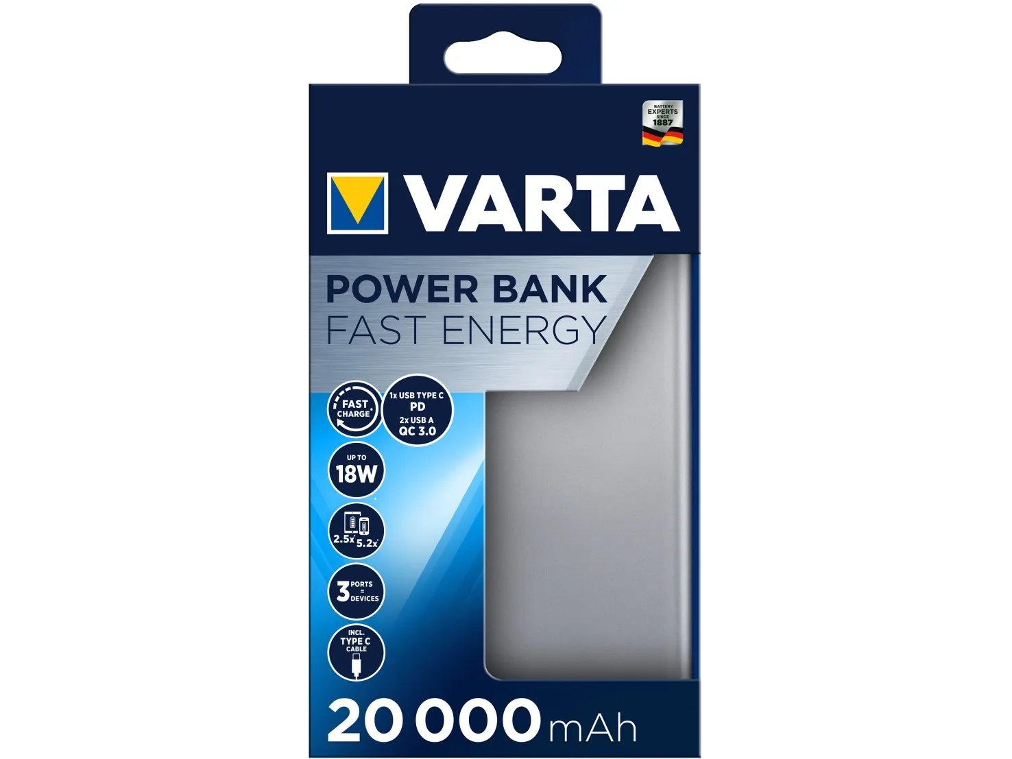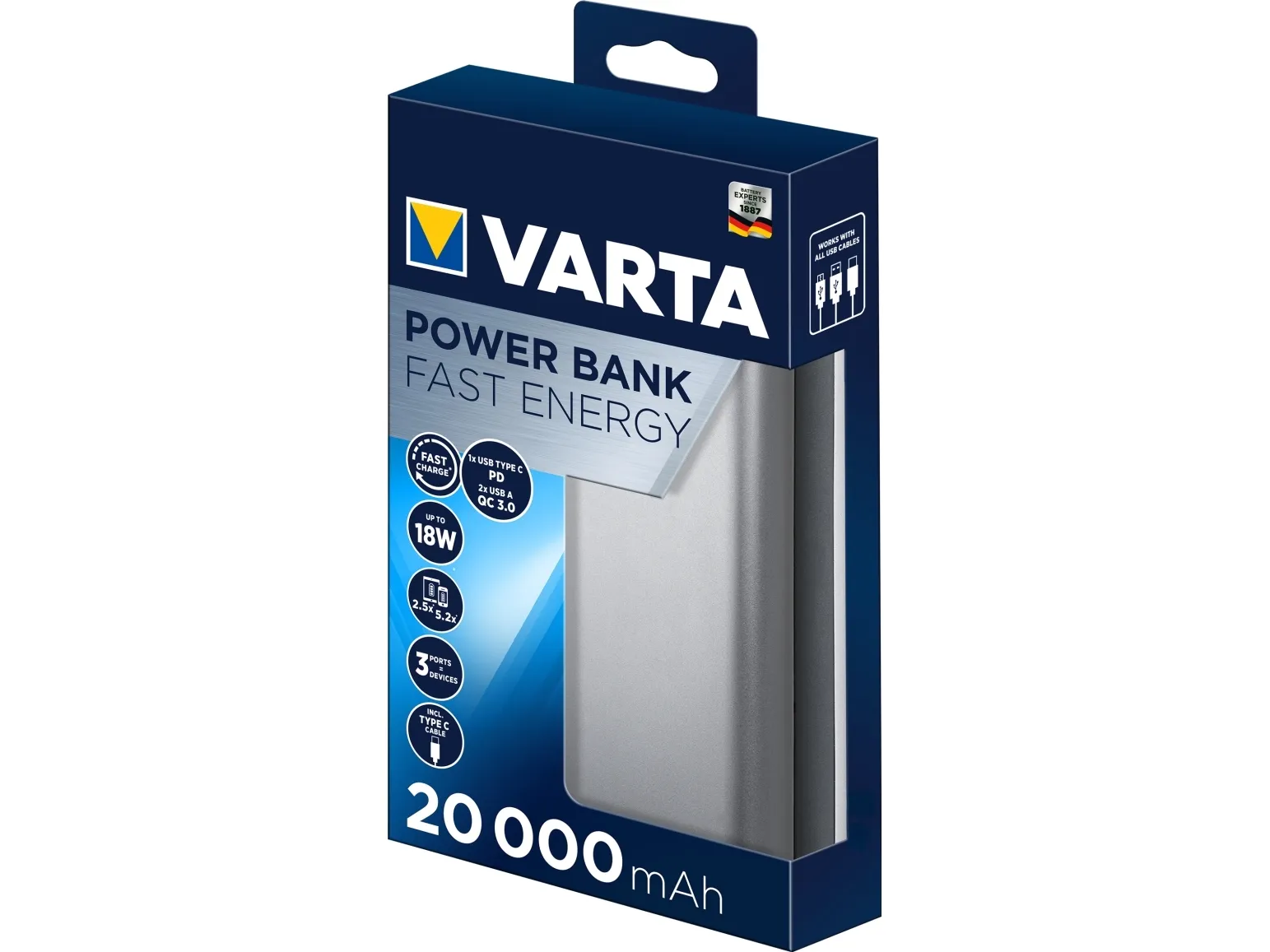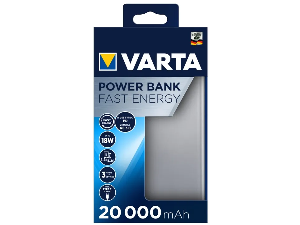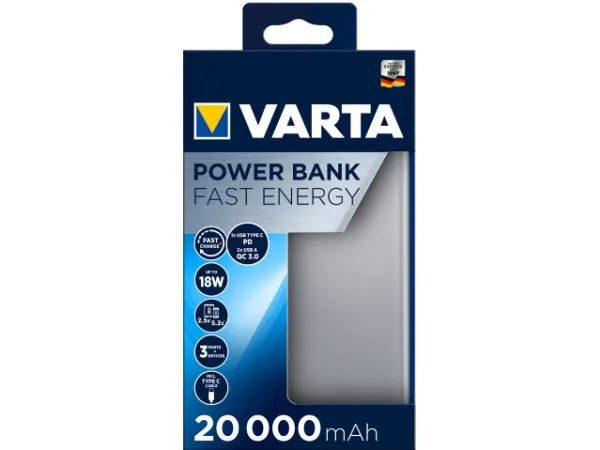 The VARTA Fast Energy Power Banks come in 3 different capacities ranging from 10.000 mAh up to 20.000 mAh to fit any individual energy demand. USB Type C PD and Quick Charge interfaces support ultra-fast and intelligent charging to power devices 20 % faster charging compared to regular USB ports. Advanced Safety Technology and premium aluminum housing makes the VARTA Fast Energy Power Banks the perfect power source to empower maximum flexibility and independence on the go.