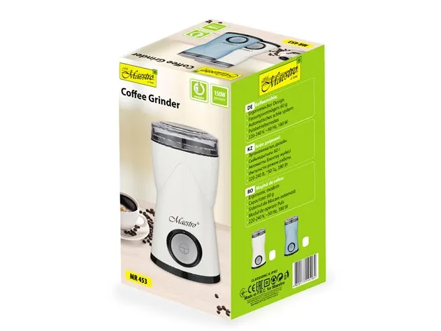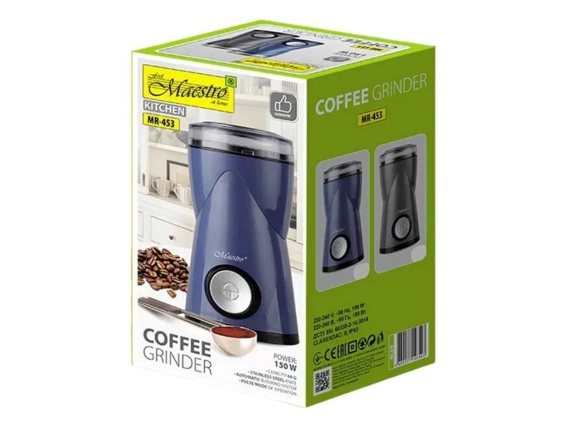 Feel Maestro MR-453-BLUE. Product type: Blade grinder, Coffee beans capacity: 60 g, Product colour: Blue. Power: 180 W, AC input voltage: 220 - 240 V, AC input frequency: 50 Hz