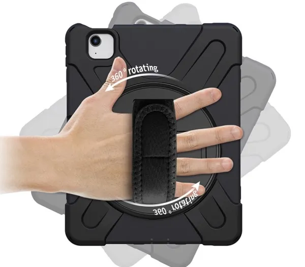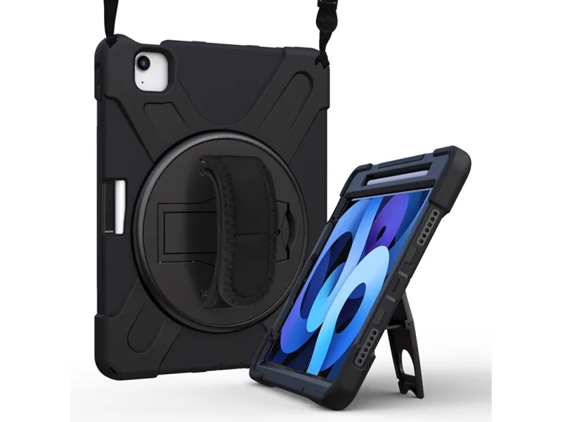 Shockproof cover designed for every day use. It is equipped with a pencil slot as well as a hand strap for a firm grip. Furthermore, it is delivered with a shoulder strap should you wish to carry the tablet in an easy way. The built-in 360degree rotatable kick stand makes it possible to use the tablet in both horizontal and vertical position. Built-in air cushion protection safeguards the tablet corners if the tablet is dropped. The raised sides on both the front and around the camera hole offers better drop protection for the camera and the front glass. All buttons are protected, but can easily be operated as well as there is easy access to all ports. The cover does not include a front glass. The cover is a three layer cover with a hard PC inner cover (2 parts) as well as a silicone skin.
