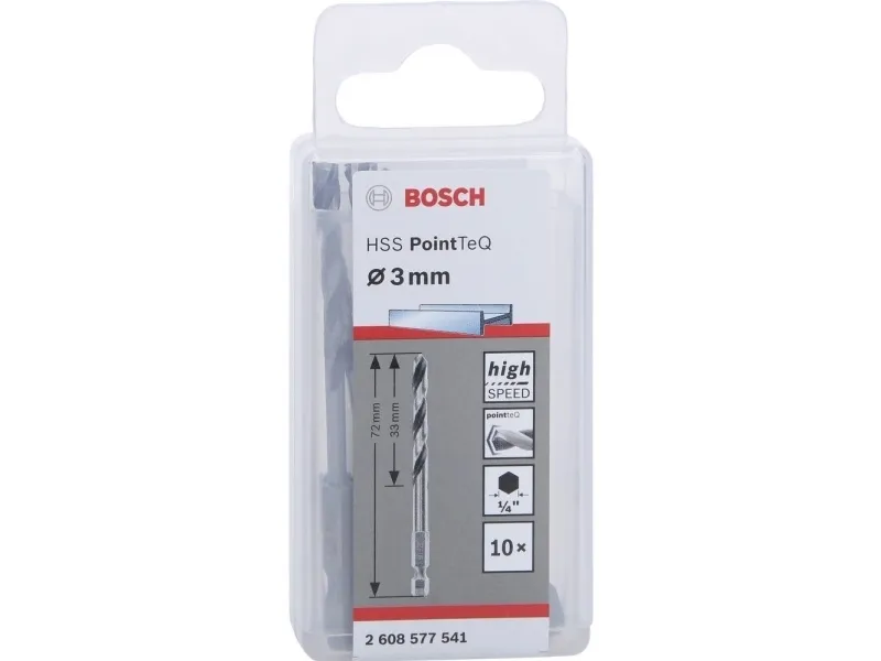 HSS PointTeQ sekskantbor 3 mm, 10-dele. HSS-spiralbor PointTq med sekskantskaft giver hurtige resultater ved boring i metal. Boret er udviklet til højhastighedsboringer og giver minimal Varme og gør boret slidstærkt. PointTeQ-designet på borspidsen sørger for kontinuerlig skarphed og lang levetid. Den selvcentrerende spids forhindrer Vandring og muliggør hurtig og nem boring. Borespiral som er belagt med sortZooxid giver mulighed for hurtig fjernelse af spåner. For en endnu højere pålidelighed giver boreets sekskantskaft stabilitet og en fast forbindelse mellem bor og for. Borets krop styrkes, og der er en lavere risiko for brud på bor med en diameter på under 6 mm. Dette PointTeQ bor er egnet til boring af gennemgangs- og centreringshuller i legeret og ulegeret stål, i ikke-jernmetaller, støbestål, støbejern og plast. Borespidsen på HSS-spiralbor PointTq med krydsslibning giver perfekt centrering. Bor, type N (lille sidespånvinkel) med 135°-design, fremstillet i henhold til din 338. Den er kompatibel med sekskantssystemer (1/4) og kan anvendes universelt med slagskruenøgler, boreskruer og borestander.