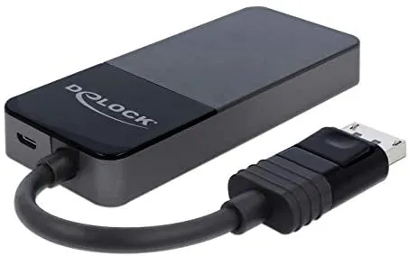 This splitter by Delock receives a DisplayPort signal from a PC or laptop and splits it to three connected displays. Thereby one DisplayPort connection can be used to operate three HDMI monitors.