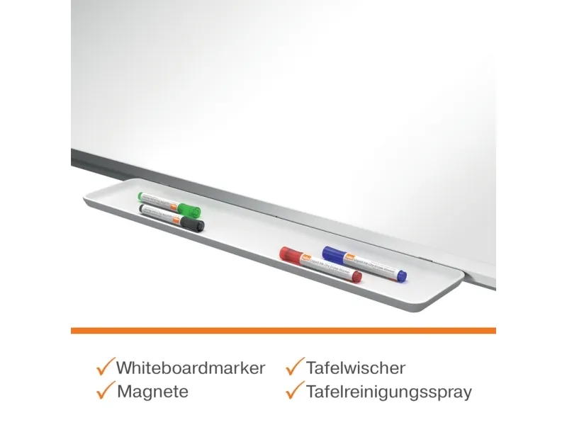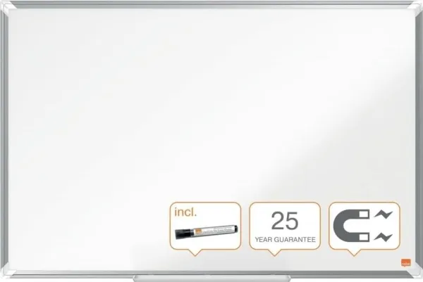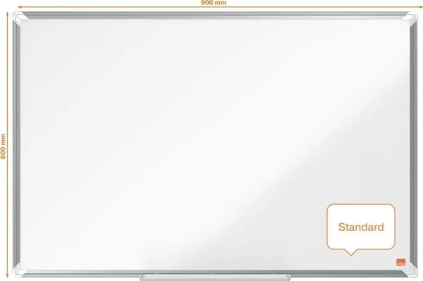 Enamel magnetic whiteboard with a modern stylish aluminum trim. Fixed by a through corner wall mounting and includes a large whiteboard pen tray for the convenient storage of whiteboard markers and erasers. The enamel magnetic whiteboard surface offers a superior level of erasability and durability for frequent use. Size: 90x60cm.