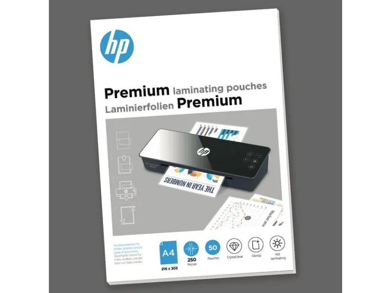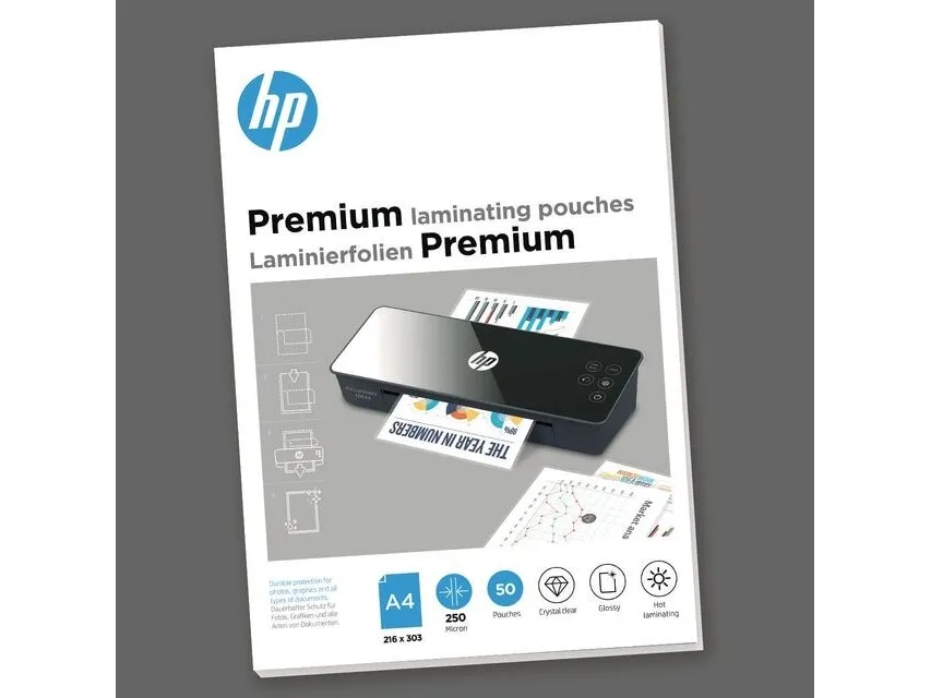 These extra thick HP Premium laminating pouches with a film thickness of a whopping 250 microns protect your important A4 documents and make them shine. With dimensions of 216 mm x 303 mm, they fit all HP laminators, but due to the thickness of the film, they can only be used with the HP Pro Laminator 1500 A3. Of course, the films are also compatible with hot laminators of other manufacturers, provided that the micron number specification is not exceeded. The transparent laminating films with glossy surface are only suitable for hot lamination and are available in a folding box with a content of 50 pieces. HP 9125. Product colour: Transparent, Surface finish: Glossy, Format: DIN A4, 216 mm x 303 mm. Width: 220 mm, Depth: 307 mm, Height: 27 mm. Quantity per pack: 50 pc(s)