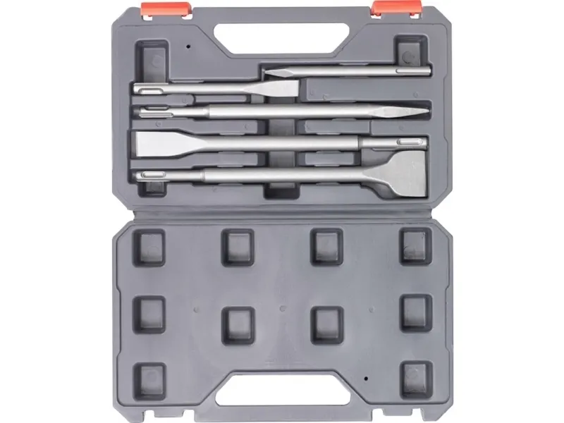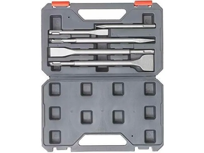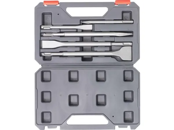 SDS PLUS SÆT MED 5 DELE SDS Plus mejselsæt 5-dele., begyndersæt til borehammeren med de mest gængse størrelser, egnet til alle nedrivnings- og renoveringsarbejder, indeholder 2 spidsmejsler i længderne 140 og 250 mm og 3 fladmejsel med målene 10 x 140 mm, 20 x 250 mm og 40 x 250 mm, Robust CR-stål med en hårdhed på HRC 50+3, med SDS-plus-skaft passende til alle borehamre med dreje-stop og SDS-plus-optagelse i praktisk opbevaringskuffert.