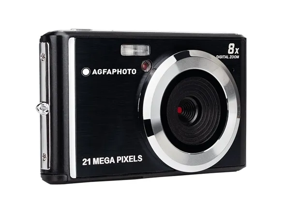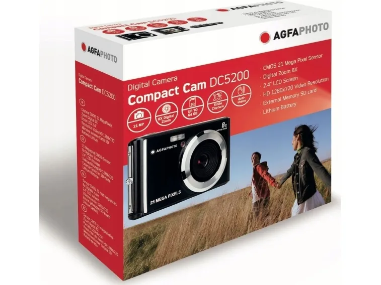 AgfaPhoto Realishot DC5200. Camera type: Compact camera, Megapixel (approx.): 21 MP, Sensor type: CMOS, Maximum image resolution: 5616 x 3744 pixels. ISO sensitivity (max): 400. Digital zoom: 8x. HD type: HD, Maximum video resolution: 1280 x 720 pixels. Display diagonal: 6.1 cm (2.4"). Weight: 89 g. Product colour: Black