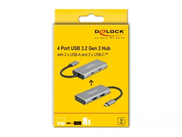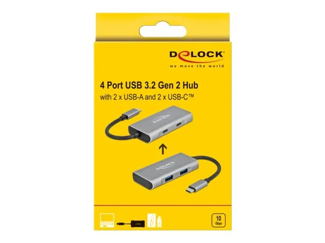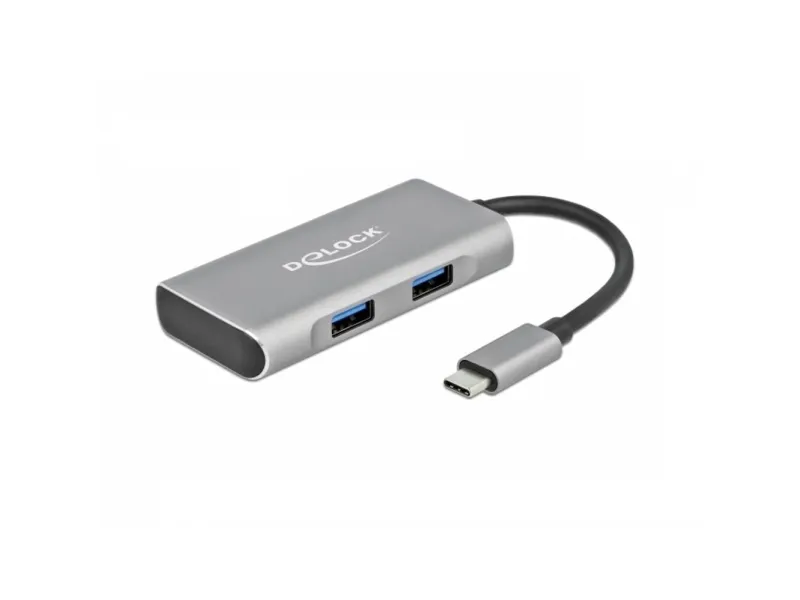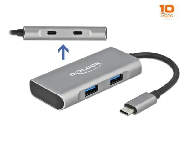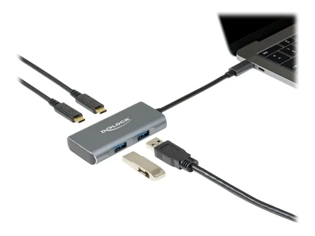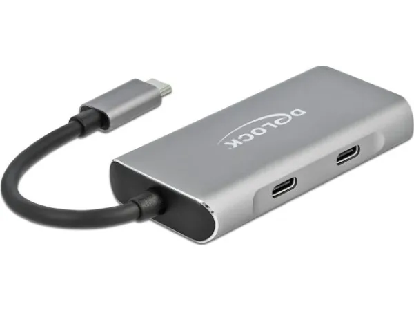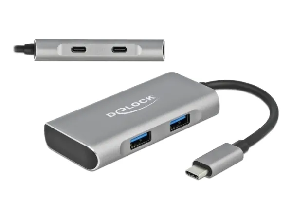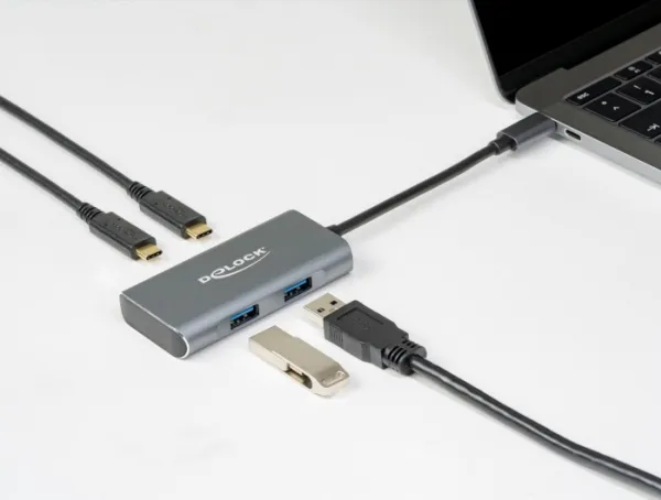 The USB hub from Delock can be connected via USB-C interface to the PC or laptop. It has two USB-A connectors as well as two USB-C connectors. Different USB devices such as docking stations, card reader, external enclosure can be connected.