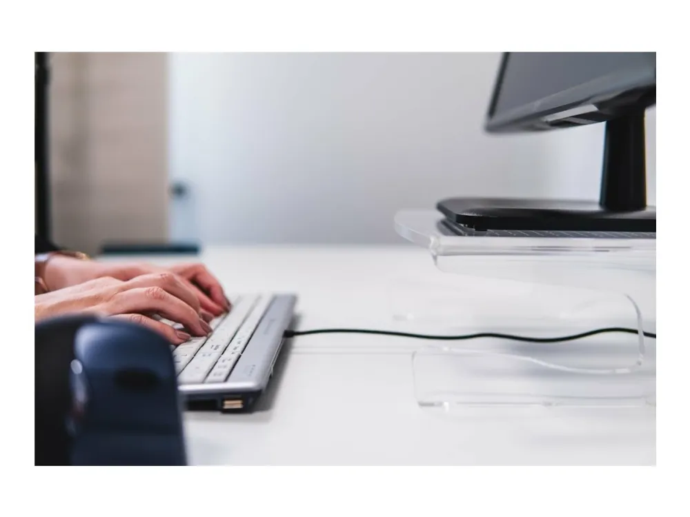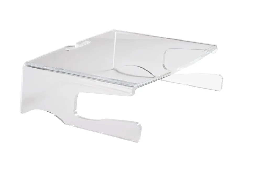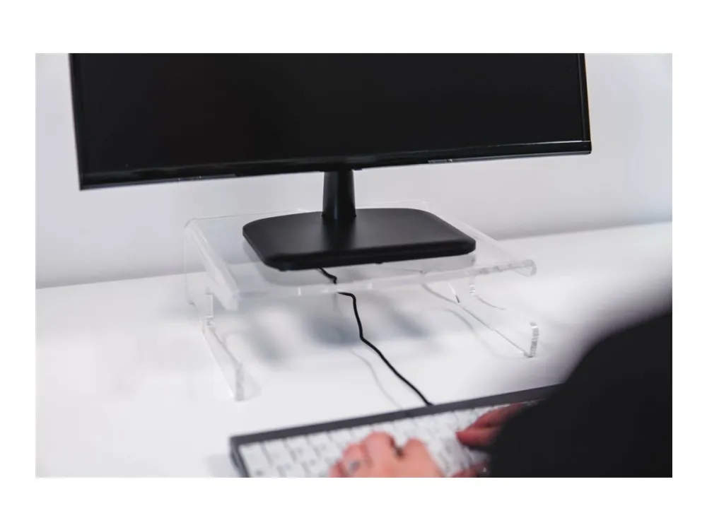 - Fixed height: 10 cm - Suitable: for both flatscreen and CRT monitors - Smart: space to clear a full-size keyboard - Cable management: integrated - Material: clear acrylic - Maximum weight: 25 kg.