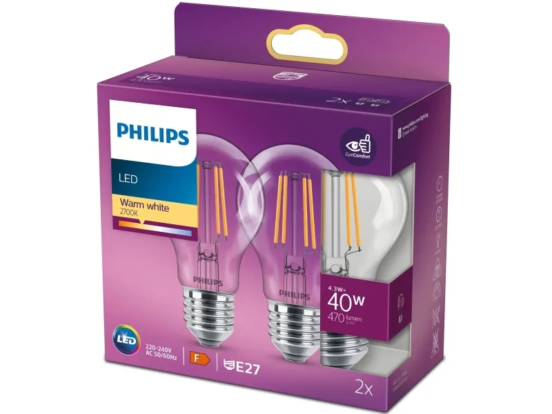 Philips - LED-filamentlyspære - form: A60 - klar finish - E27 - 4.3 W - 2700 K (en pakke 2)