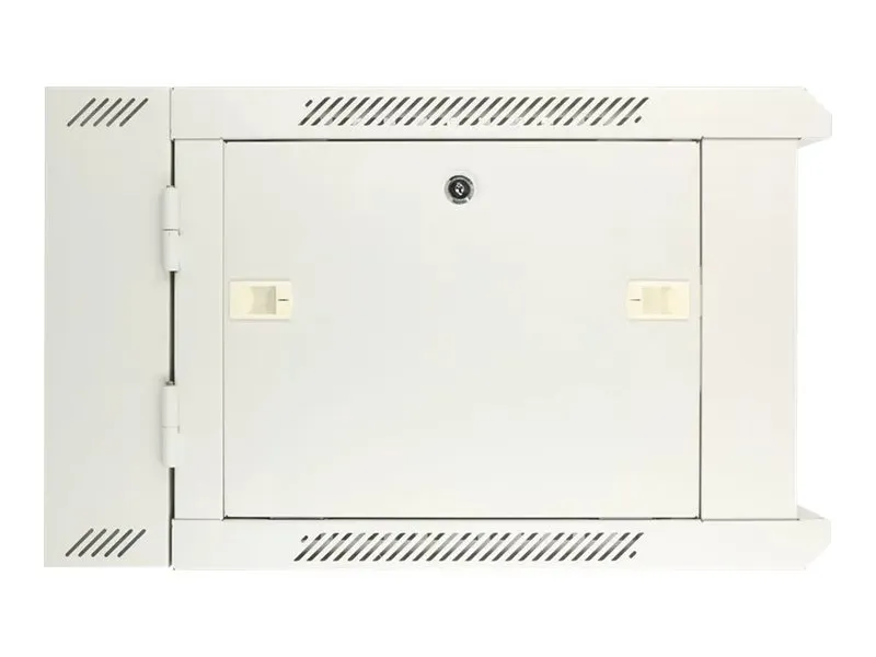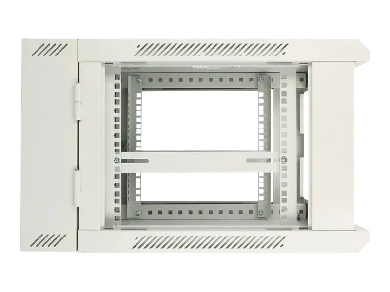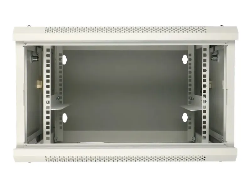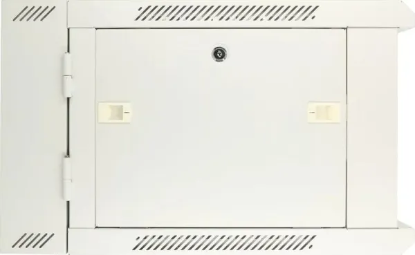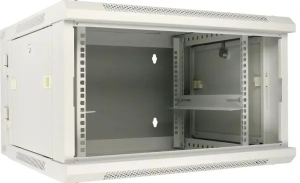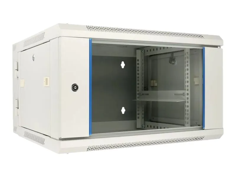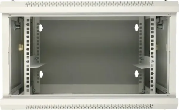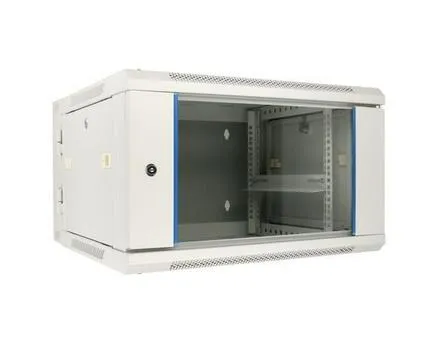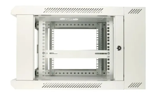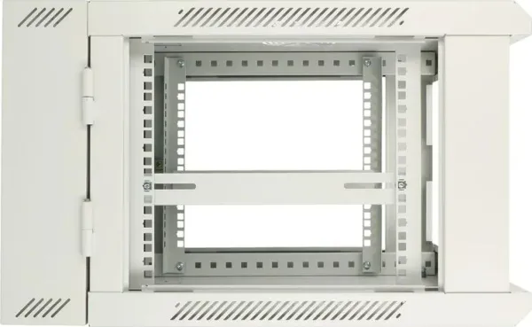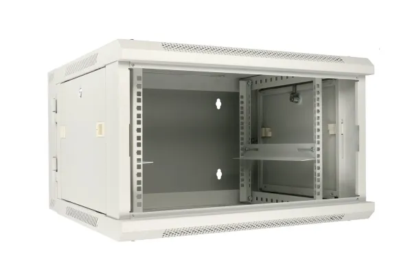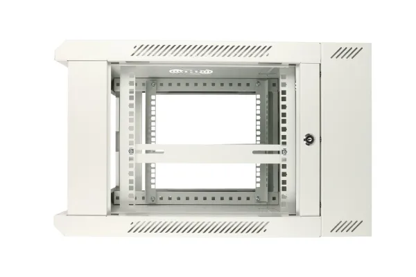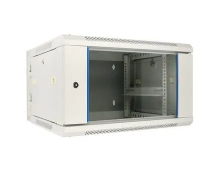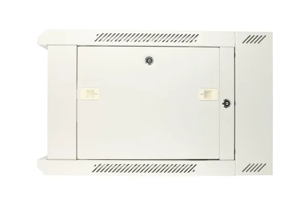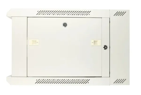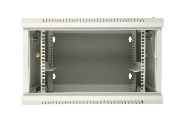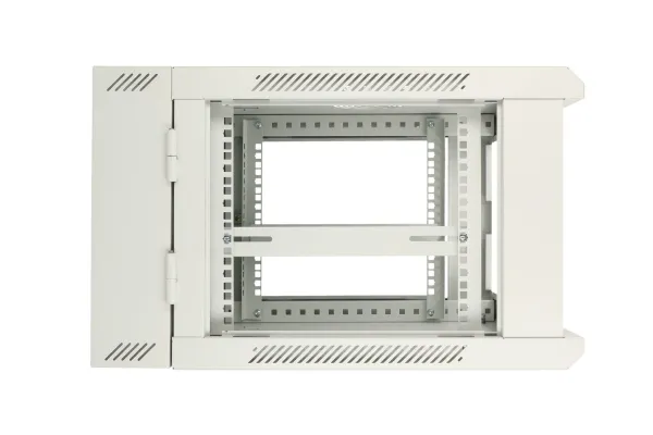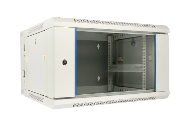 The Extralink rack cabinet is designed for wall mounting in offices, network server rooms and CCTV control rooms. The external walls are made of cold-rolled steel sheet, while the front door has a tempered glass pane with the possibility of opening to the left or right side. Two-section construction facilitates access to the installed components from the back.