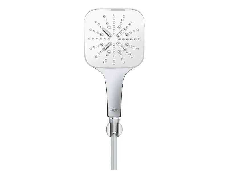 GROHE's Rainshower 130 SmartActive Cube hand shower set – cutting edge technology and minimalist design! It's time to give your shower an instant upgrade with the stylish GROHE Rainshower 130 SmartActive Cube hand shower with white spray plate. Made in Germany, it comes with a TwistFree Silverflex shower hose (1500mm) and a wall holder and is packed with innovative technology. GROHE SmartTip – an ergonomic controller on the rear of the handle – gives you fingertip control of the spray pattern: pulsating GROHE ActiveMassage spray, which delivers a whole new level of revitalising massage power, invigorating Jet Spray and Rain Spray – as gentle as summer rain. When you turn the water off GROHE DripStop minimizes annoying drips from Rain and Jet spray. And thanks to GROHE DreamSpray, with every pattern the flow from every nozzle has a perfectly balanced flow for maximum satisfaction, and the SpeedClean anti-lime nozzles are extra easy to clean too. It also has GROHE EcoJoy, which limits water flow to 9.5 l/min but also delivers pure indulgence, and the scratch resistant GROHE StarLight finish will stay looking pristine for years. Plus the Inner WaterGuide prevents the surface from getting too hot, protecting both your skin, and the sparkling chrome. GROHE Rainshower 130 SmartActive Cube hand shower set – statement modern style with premium performance!