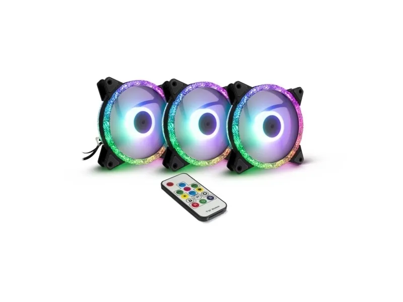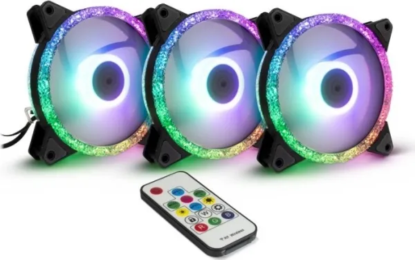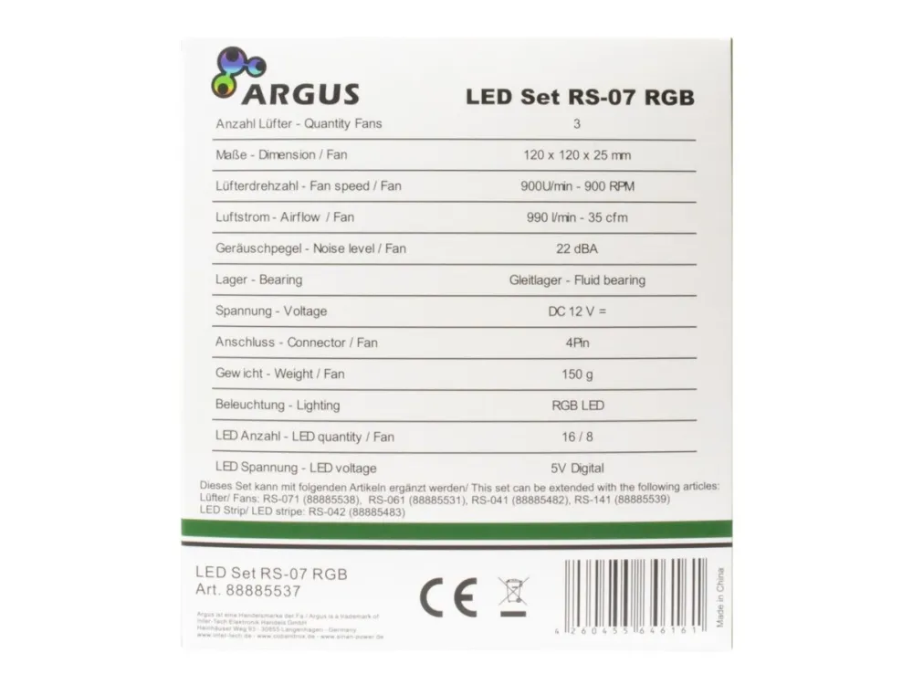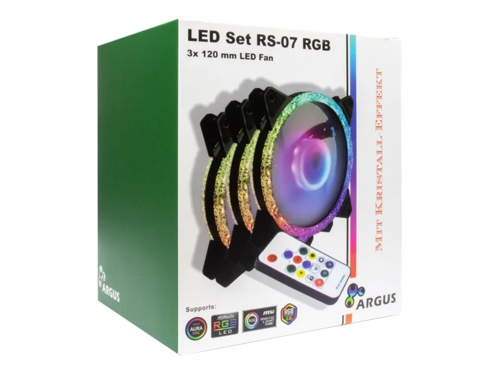 The three 4pin PWM 120mm RGB fans from Argus offer great lighting for your PC case and, with the included wireless remote control and control unit, offer over 300 different effects and modes. If that is not enough, you can also manage and control all RGB LEDs synchronously via the mainboard using the integrated 5V RGB header (addressable RGB LEDs).
