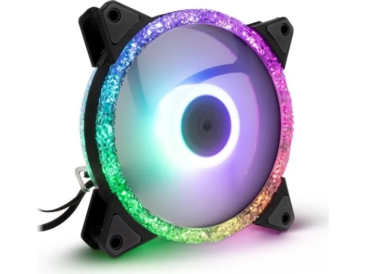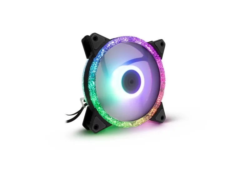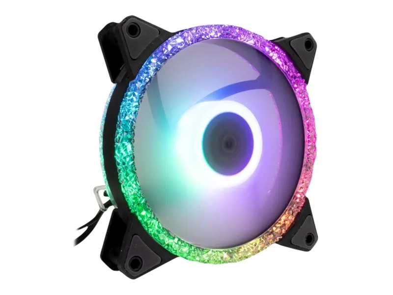 The 24 integrated RGB LEDs, placed behind two transparent crystal effect rings per 120mm fan, guarantee exceptional lighting effects. Rubberized pads below the mounting holes reliably prevent the fans from transmitting vibrations to the PC case and ensure smooth operation at up to 900 rpm and 22 dBA.