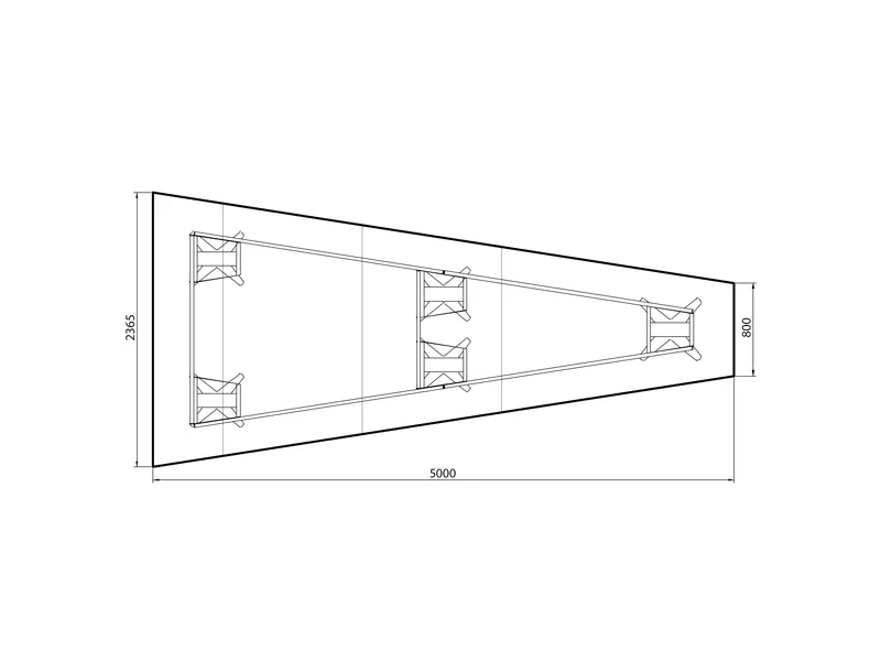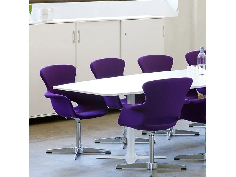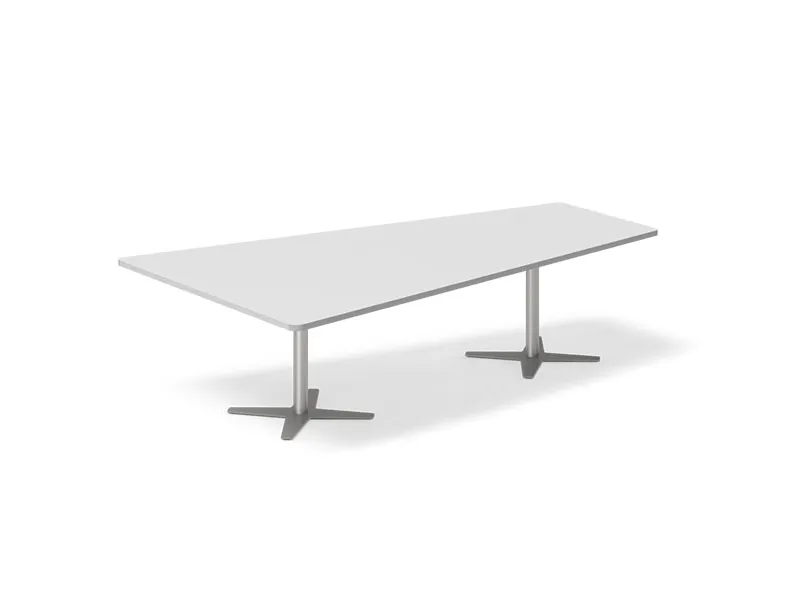 Konferencebord i DNA møbelserie, med lys grå trapez bordplade på hvidt understel. Længde x største dybde er 5000 x 2365 mm.Med større brug af skærm og udstyr for videokonference i møderum, har også behovet for synsoptimale mødebord meldt sig. Derfor tilbyder vi som en naturlig del af møbelserien DNA, et udvalg trapez formede konferenceborde. Dette er flotte og prisgunstige borde som ikke går på kompromis med hverken design eller kvalitet. Bordpladen er 25 mm, lys grå laminat, afrundede hjørner med lige kant i antracit farve. Dette er stiligt!Konferencebordet leveres på et solidt understel. Vælg en farve på understellet - således at du kan tilpasse til farven på dine konferencestole, så du får en flot helhed. Bordets mindste dybde er 800 mm og det har højde 750 mm.
