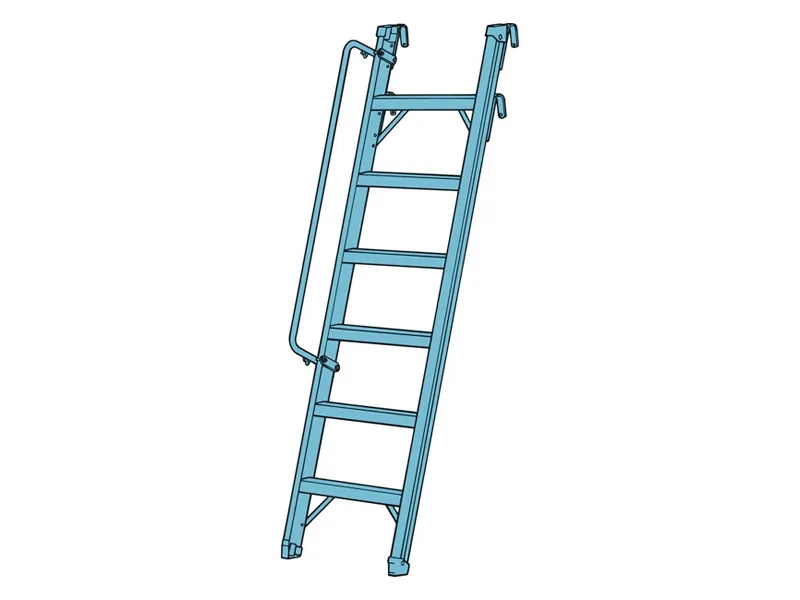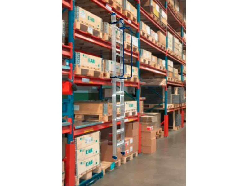 Lagerstige som kan benyttes til pallereoler, lagerreoler osv. De topmonterede kroge hænges på en bærebjælke (pallereol). Ophængskrogene frigør gulvplads, når stigen ikke benyttes. Øvre og nedre tværstag bidrager til øget stabilitet.