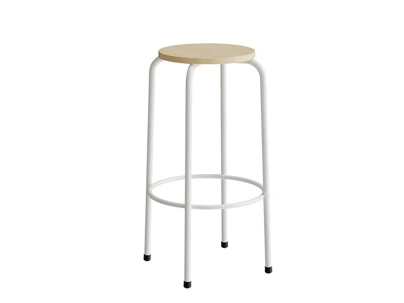 Taburet Bertil 117 med rundt sæde i diameter 330 mm i massiv birk eller krydsfiner belagt med birkelaminat. Stel i lakeret stål med fodring. Fødder leveres med plastik gulvbeskyttelse.