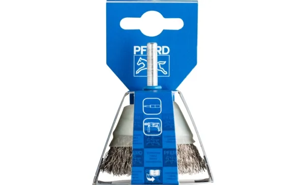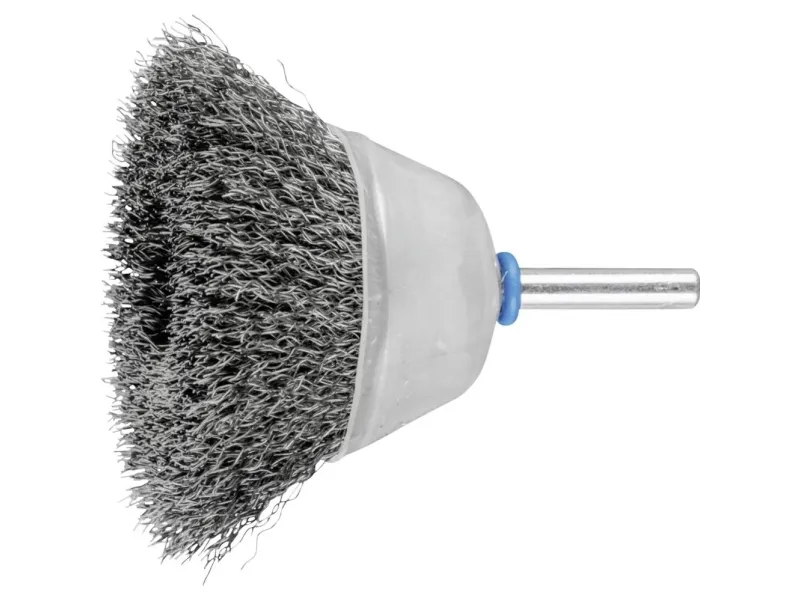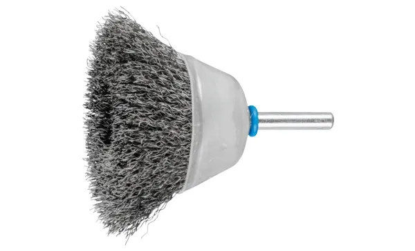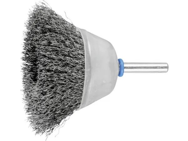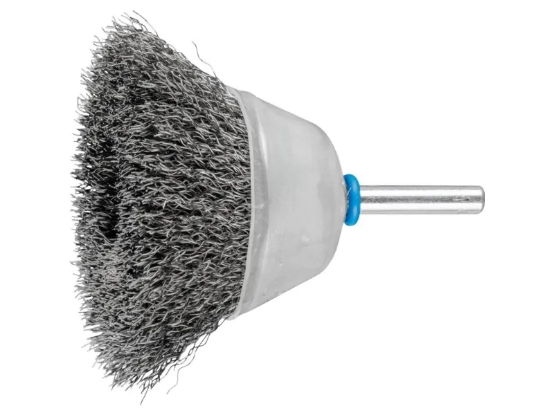 Kopbørste upint TBU Ø 50 mm skaft-dia. 6 mm tråd-dia. 0,30 i rustfrit stål Kan anvendes universelt til rengøring, rustfjernelse og udglatning samt fjernelse af korrosion og lak. På grund af indsatsen i fronten med hele børsteoverfladen er den særligt velegnet til arbejde på store, plane og let tilgængelige overflader.