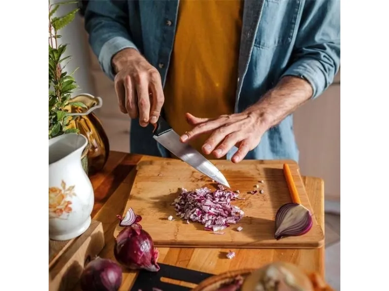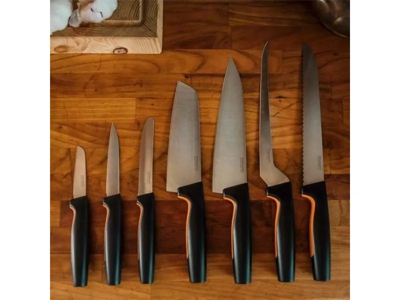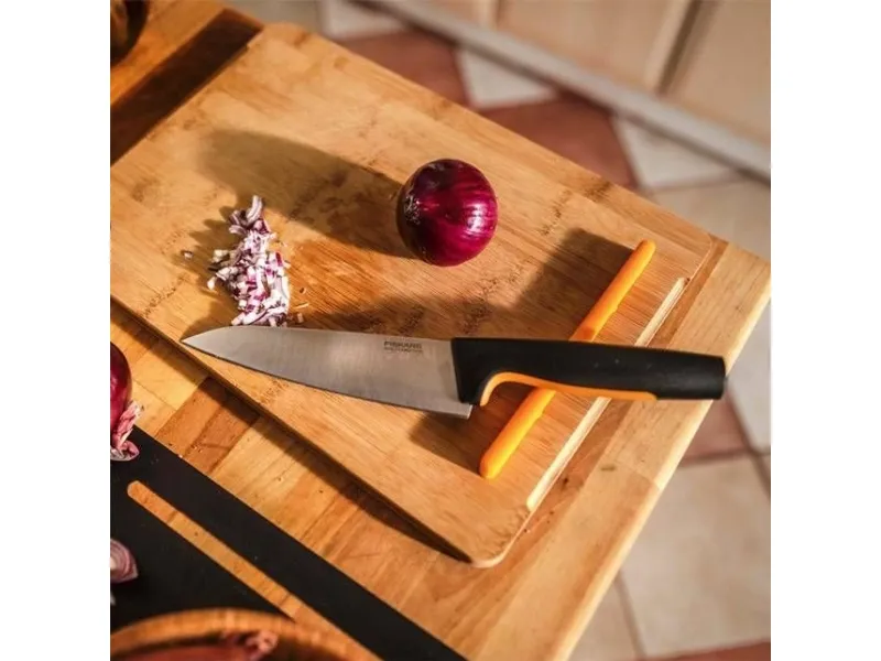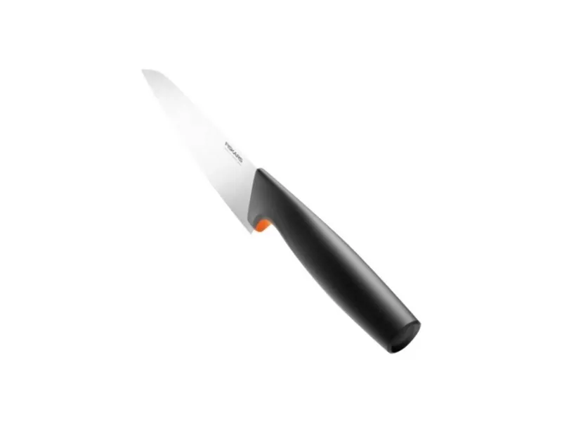 Fiskars Functional Form medium kokkekniv er en allsidig hverdagskniv for kokker som setter pris på smart design og vedlikeholdsvennlige kjøkkenredskaper. Det slitesterke bladet i rustfritt stål er slipt for utmerket ytelse og er ideelt til å skjære kjøtt, hakke grønnsaker, hakke urter og mye mer. Det ergonomiske håndtaket har SoftGrip på fingertuppene og en dyp fingerbeskyttelse som gjør at kniven ligger godt og trygt i hånden. Som alle knivene fra Functional Form kan også denne kniven vaskes i oppvaskmaskin for enkel daglig rengjøring, og den slanke profilen gjør den enkel å oppbevare.