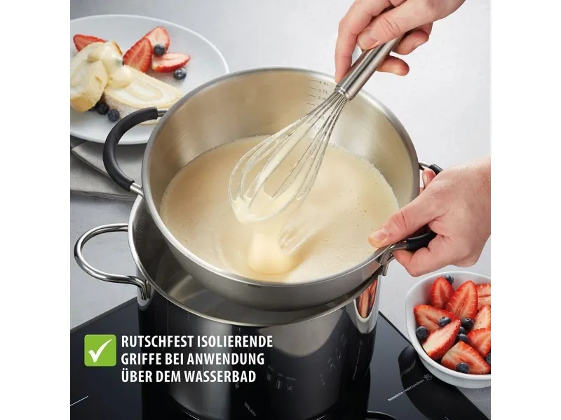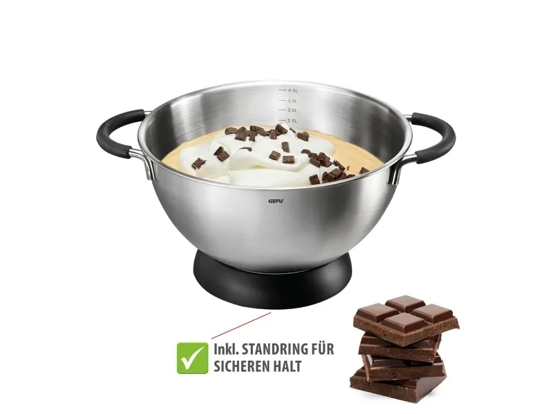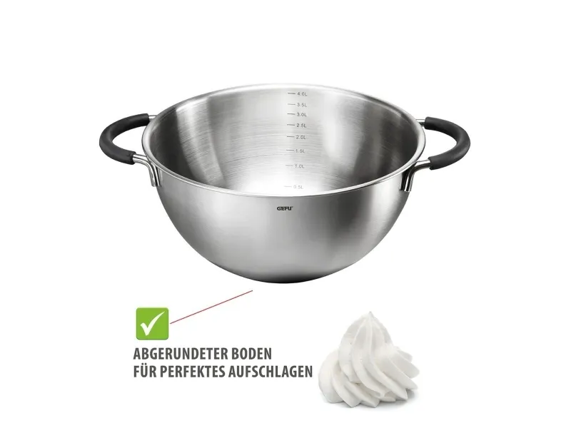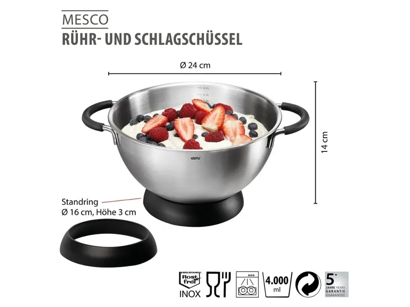 Resting on its plastic base, the mixing and beating bowl MESCO, which is made of high-grade stainless steel, has a safe stand when it comes to kneading dough or whipping a fine cream dessert. At a capacity of 4 liters, the dishwasher-safe bowl with its graduation inside is equally perfect for tossing salads. The handy bowl handles are covered with a layer of silicone, providing a safe hold even with wet hands.