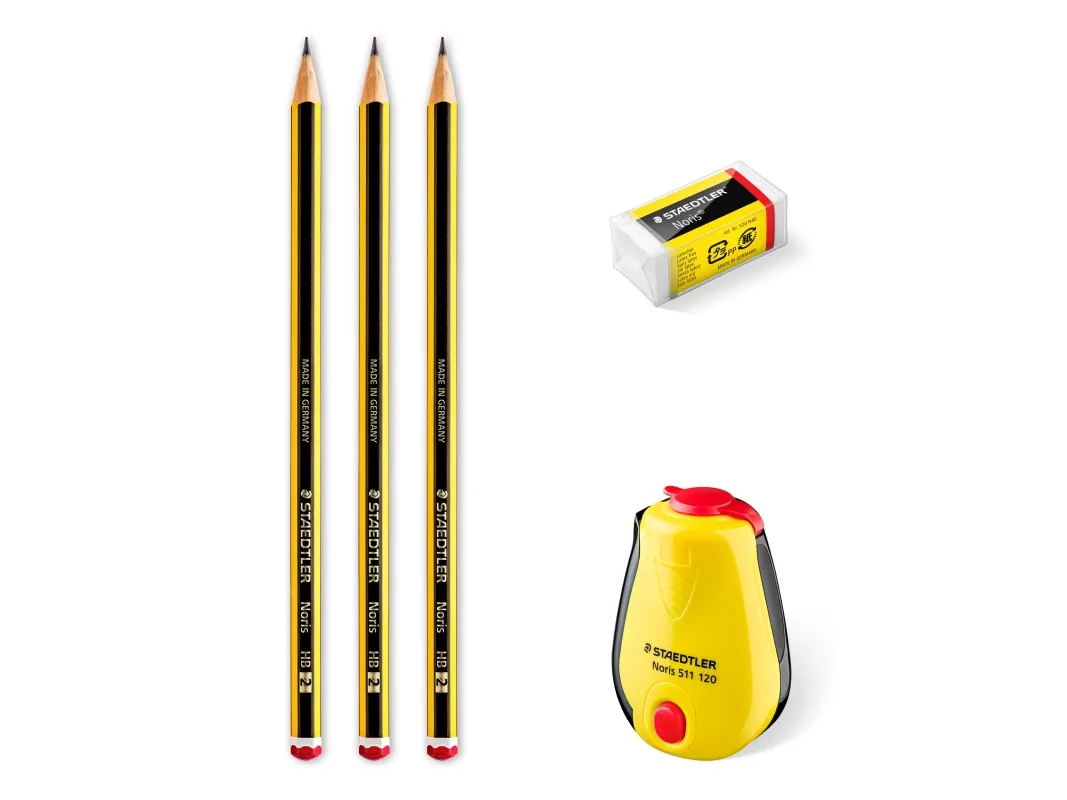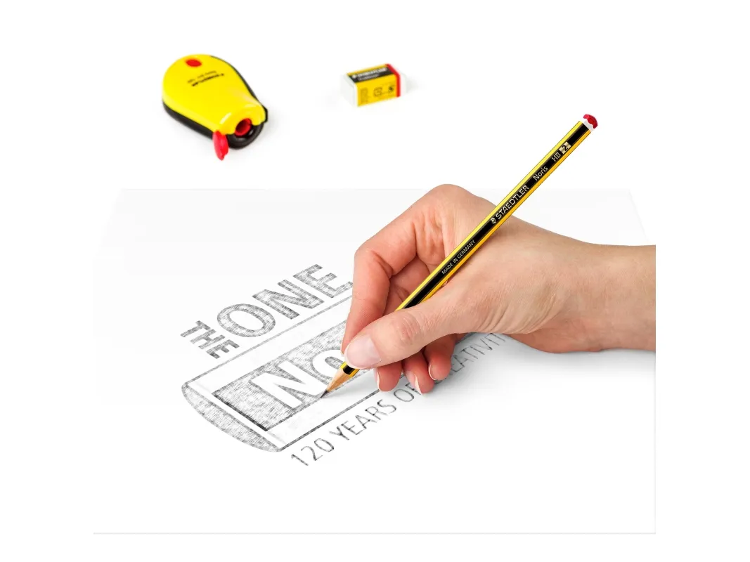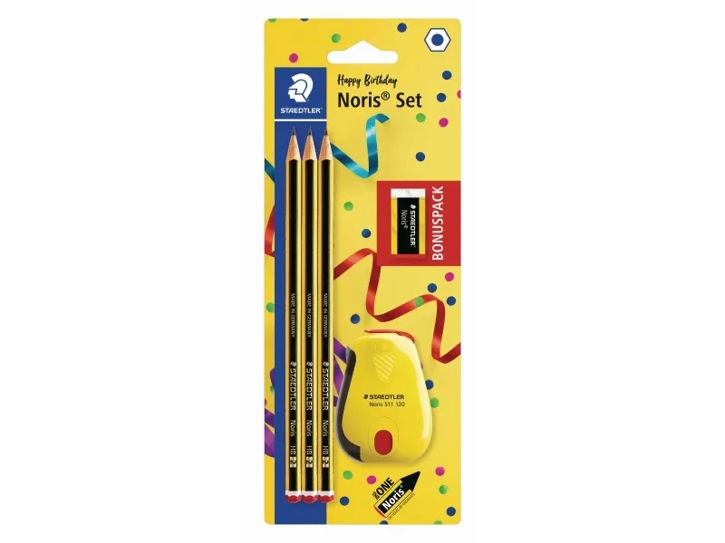 Jubilæumssæt med blyanter, Staedtler® Noris 120 Jubilæumssæt med blyanter til skrivning og tegning med en stift af høj kvalitet, som glider let over papiret og er nem at viske ud. Viskelæder samt blyantspidser til både højre- og venstrehåndede medfølger. Blyanten har en hårdhed på: HB Best.enhed: pakke a 3 stk.