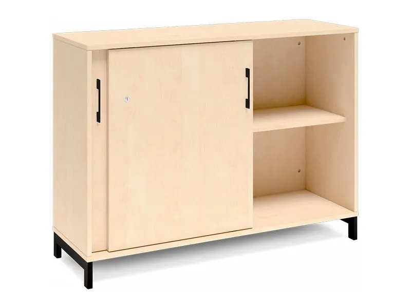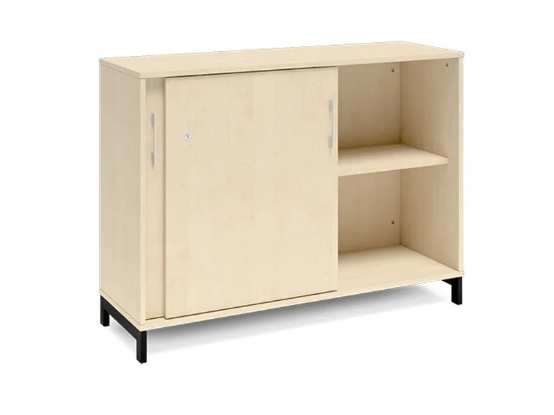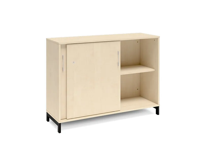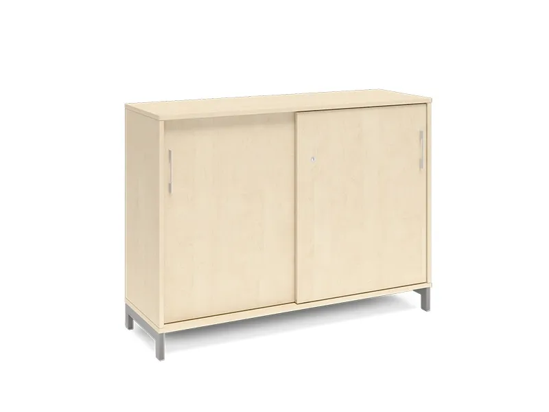2A4 kontorskab i kontormøbelserien DNA, med 2A4 skydedør, udvendig bredde x dybde x højde, 1200 x 400 x 890 mm, inkl. understel. Dette kontorskab leveres med birk laminat kabinet i kombination med birk laminat døre og på et flot sort understel, miljørigtig pulverlakeret.