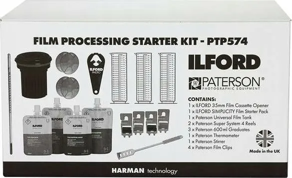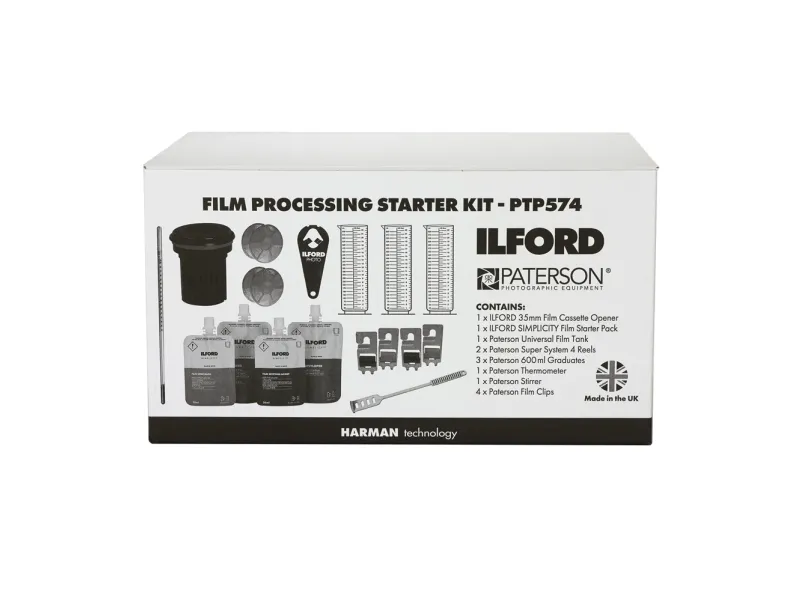 Unfortunately we are out of stock of this item, please see the Paterson FILM PROCESSING STARTER KIT (PTP573) this is a very similar product (No chemicals)This co-branded ILFORD and Paterson starter kit contains everything* needed to process your first rolls of film. From a developer, stop bath, fixer and wetting agent to the perfect sized developing tank and measuring cylinders for processing two rolls of 35mm film at a time (or one 120 roll).The technique to process your own film is simple and rewarding and made even easier thanks to ILFORD Simplicity chemicals which are pre-measured for speed and ease of use. While these chemicals can easily be used in most developing tanks the measurements were based on the Paterson 2-reel Universal Film Development Tank contained in this kit making it the ideal pairing.The kit contains: 1 x ILFORD 35mm Film Cassette Opener, 1 x ILFORD Simplicity Film Starter Pack (containing developer, stop bath, fixer and wetting agent), 1 x Paterson Universal Film Tank, 2 x Paterson Super System 4 Reels, 3 x Paterson 600ml Graduates, 1 x Paterson Thermometer, 1 x Paterson Stirrer, 2 x Paterson set of 2 film clips.*A darkroom, light tight space, or dark changing bag will be needed to load the film into tank.Ilford PTP574. Product colour: Multicolour