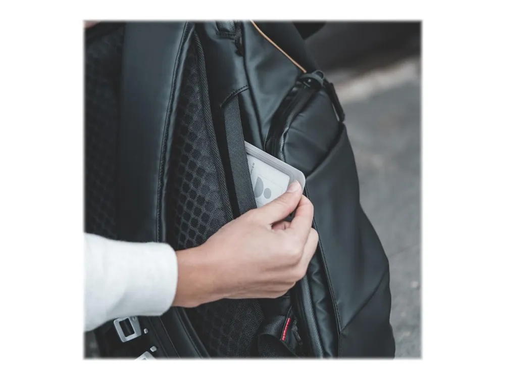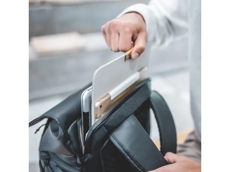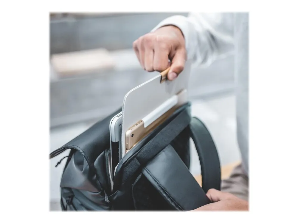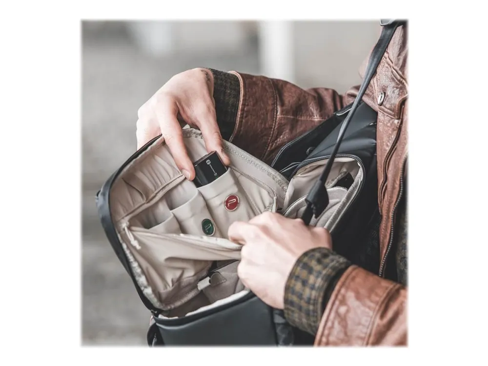 Notebook, kabel, nøkler, 2 x pen, 3x x batterier, magnetisk frontlomme, magnetisk baklomme, frontnettlomme, skjult rom, skjult bunnlomme, 4 x interne glidelåslommer, 2 x intern lomme, 2 x utvendig lomme