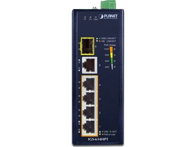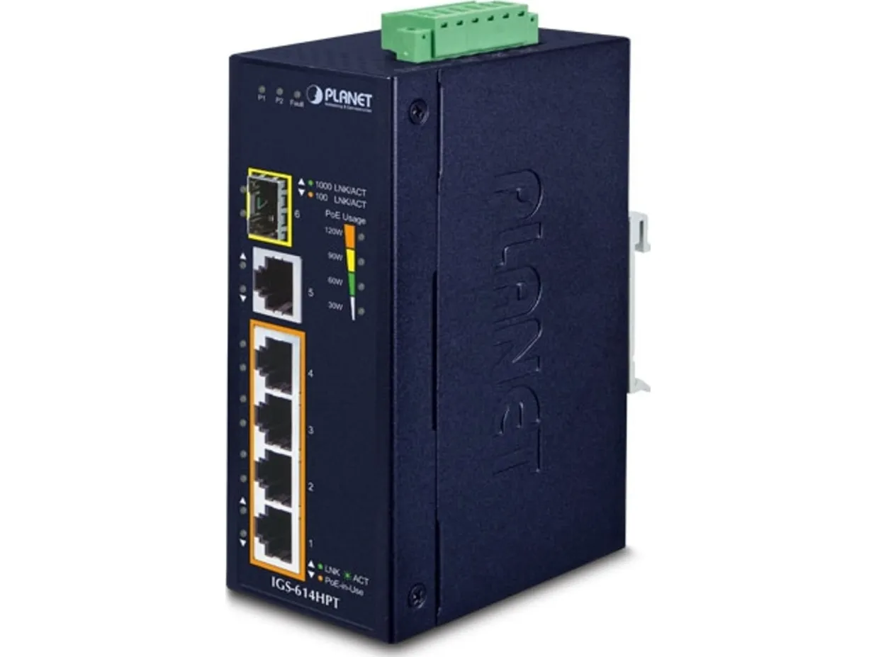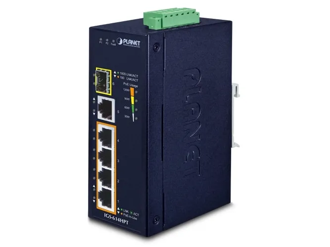 Featuring Plug and Play designed to be installed in heavy industrial demanding environments, the IGS-614HPT is a PLANET industrial-grade, DIN-rail type unmanaged Gigabit Ethernet PoE+ switch with four 10/100/1000BASE-T ports featuring IEEE 802.3at PoE+, one extra 10/100/1000BASE-T RJ45 copper and one 100/1000BASE-X fiber optic interface for uplink connection.