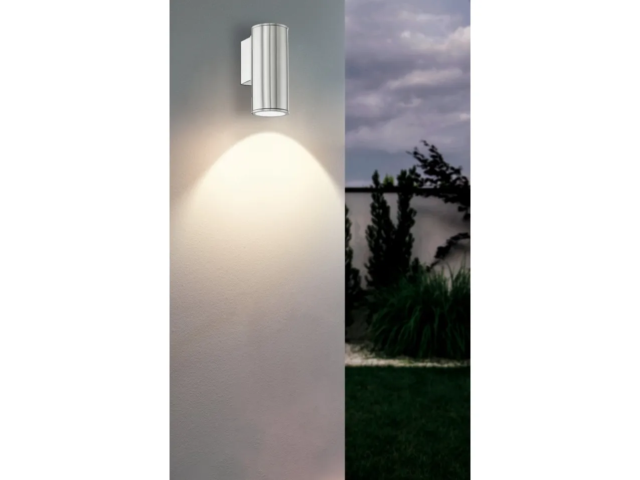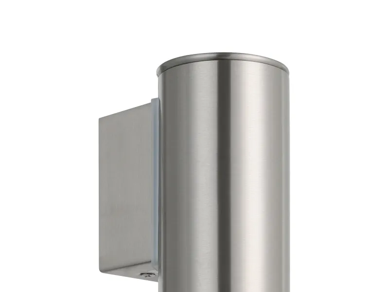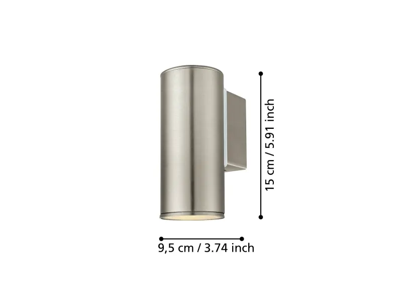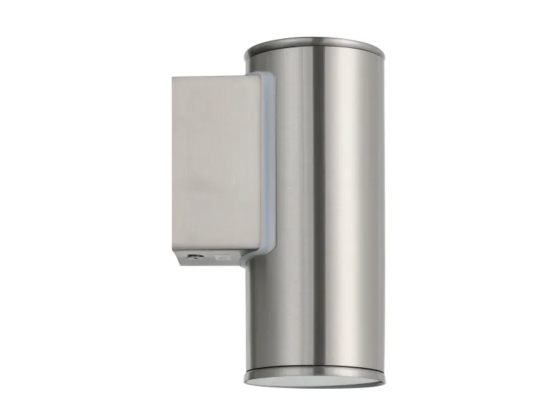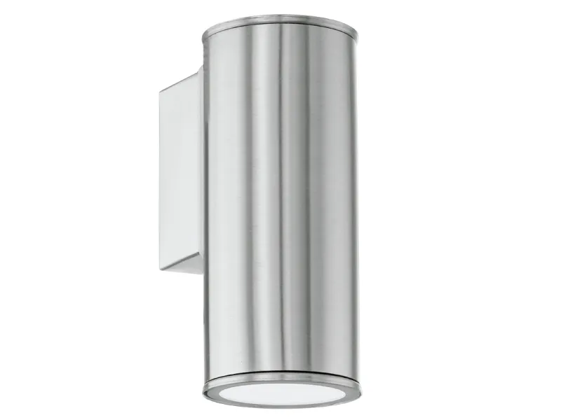 EGLO RIGA udendørs væglampe i rustfrit stål. Hjørnemontering er muligt. Højde 15 cm, længde 6,5 cm, dybde 9,5 cm. GU10, 2,8 watt, 250 lumen, 3000 kelvin. IP44. Dette produkt indeholder en lyskilde med energieffektivitetsklasse: F.