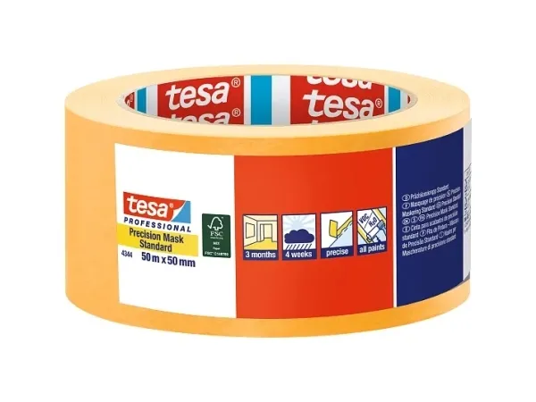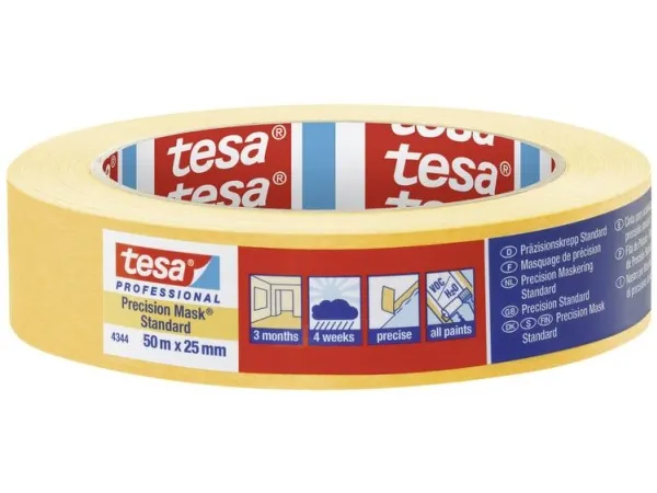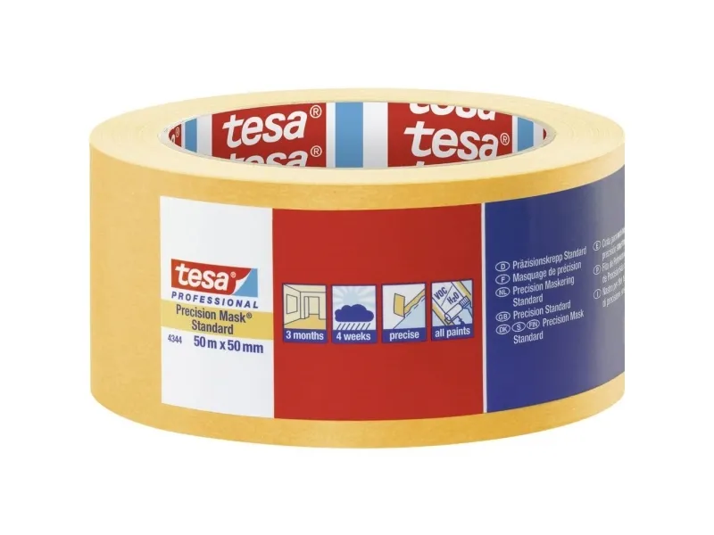tesa Præcisionscrepe® 4344 standard til flade og kantskarpe farve- og lakkanter tesa Præcisionscrepe® 4344 standard opnår flade, kantskarpe farve- og lakkanter og giver en høj forarbejdningskomfort Det består af en tynd papirbærer, der er udstyret med akrylat-klæbemasse. Takket være den overlegne og afbalancerede tesa®-klæbekvalitet er det muligt at anvende malerbåndet til førsteklasses maler- og lakeringsarbejde indendørs i op til 3 måneder, udendørs i op til 4 uger. Takket være gennemsigtigheden kan præcisionscrepe nemt positioneres og er smidig på mange underlag. Dermed bortfalder unødvendige farvenuløbere og en tidskrævende efterbehandling. Med tesa præcisionscrepe® 4344 standard har du et malerbånd af høj kvalitet, som opnår praktiske og professionelle resultater.