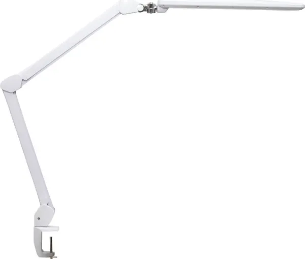 Powerful LED workstation lamp with an appealing design Stepless dimmer with touch function on the lamp head Perfect for professionals: ideal for laboratories, workshops, engineering offices and studios Extremely economical: latest LED technology, high energy efficiency Solid: robust metal arm made of steel tube with inner spring and sturdy desk clamp with steel inlay Technical safety concept Made by MAUL Noble: white high-gloss surface Three-dimensionally adjustable lamp head Homogeneous light distribution and optimized glare protection by diffusion disk Illuminance of the lamp: 2960 lux illuminance at 35 cm distance Colour temperature per light source: 6500 Kelvin (daylight white) Number of light sources: 1 Energy efficiency class per light source: E (spectrum A to G) Weighted energy consumption per light source: 13 kWh/1000 h Life per light source (L70B50): 10000 h Useful luminous flux per light source: 1721 Lumen Material: Arm: metal, steel tube - Desk clamp: metal, plastic coated Dimensions: Height: 47 cm - Arm: lower arm length 40 cm, lower arm length 44 cm - Head: 8x45 cm - Base: clamping width: 1-6,3 cm Movement: Head: inclinable, rotatable - Arm: inclinable, rotatable Position of the switch: Lamp head Environmentally friendly and safe packaging, recyclable Technical safety concept Made by MAUL: we never include a lamp or illuminant in our range unless it has successfully passed intensive testing. The safety of the LED workstation lamp MAULcraft, dimmable is guaranteed by our optical, electronic and mechanical development team as well as production engineering team
